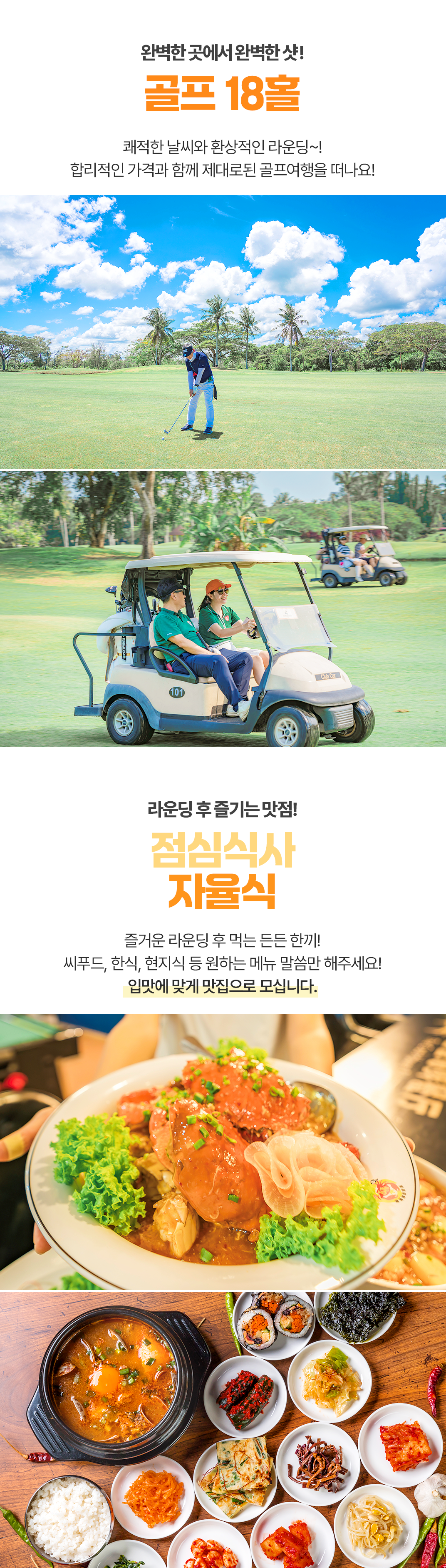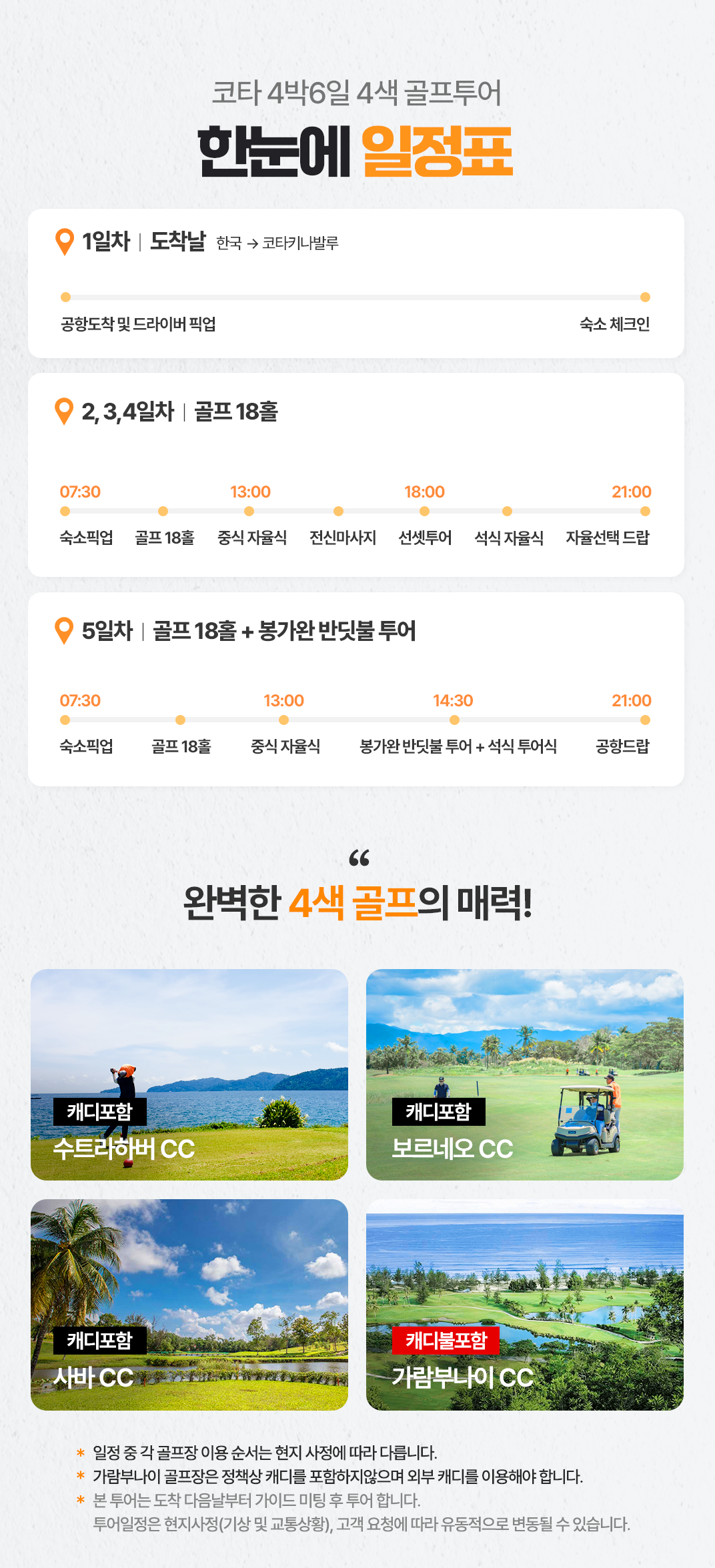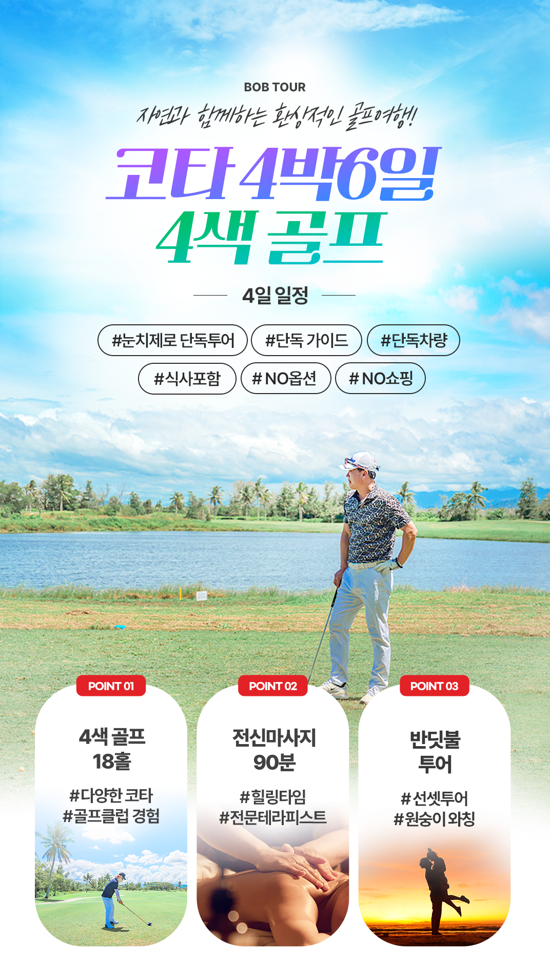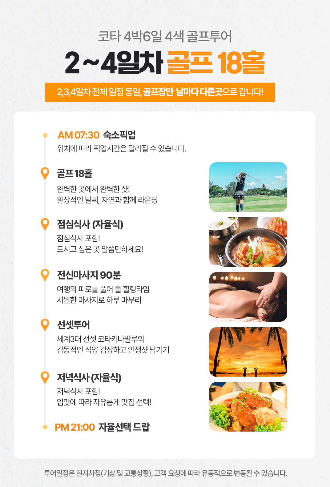픽업(07:30) → 골프 18홀+점심식사(자율식) → 전신마사지 90분 → 선셋투어 → 저녁식사(자율식) → 숙소 드랍(21:00)