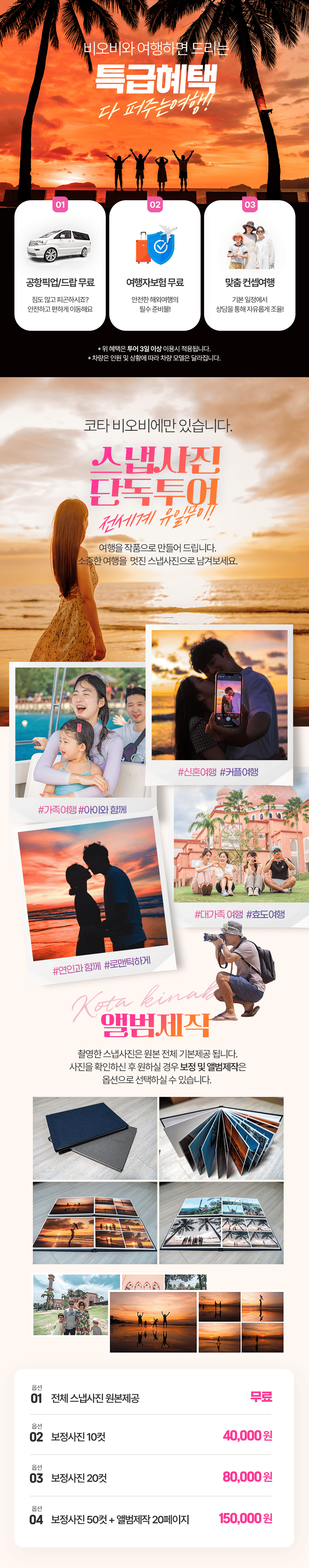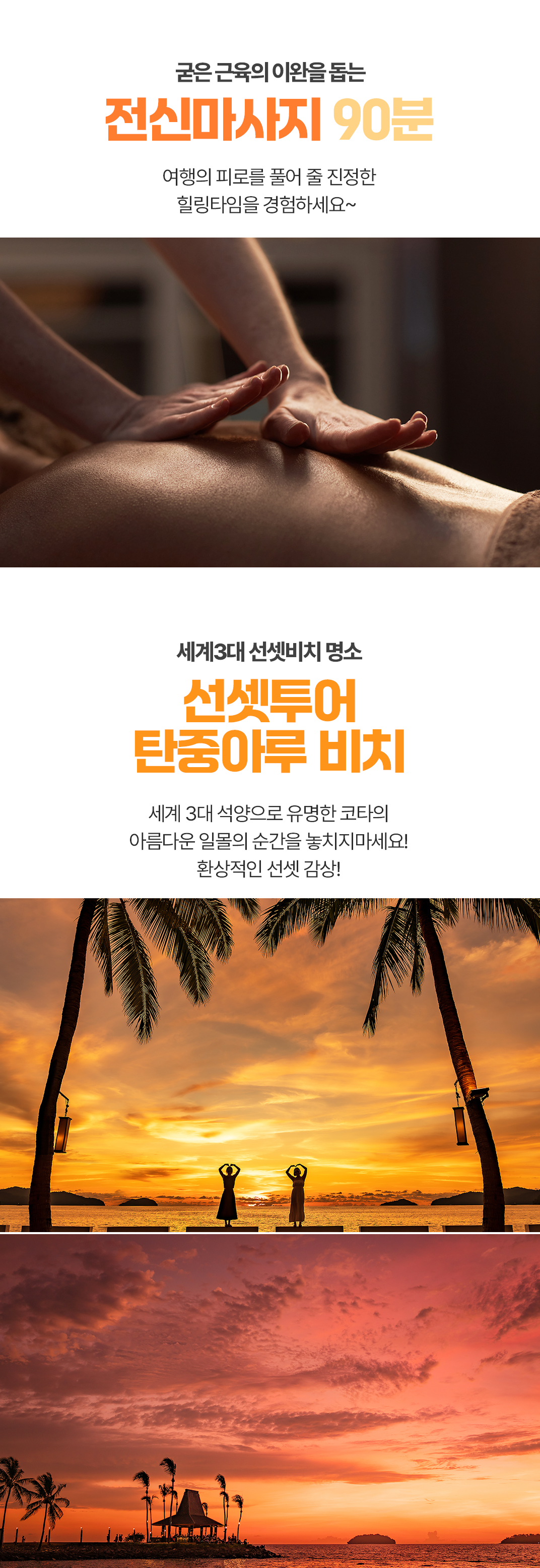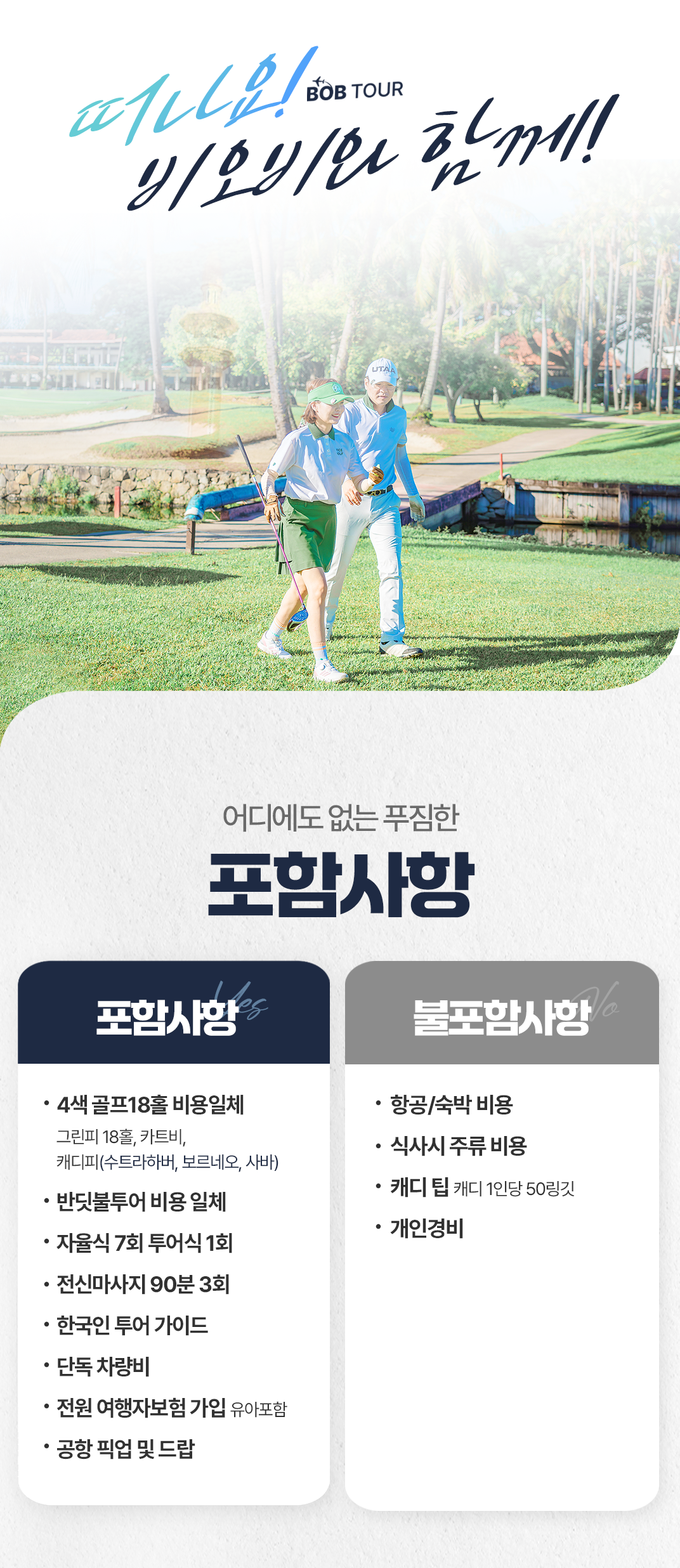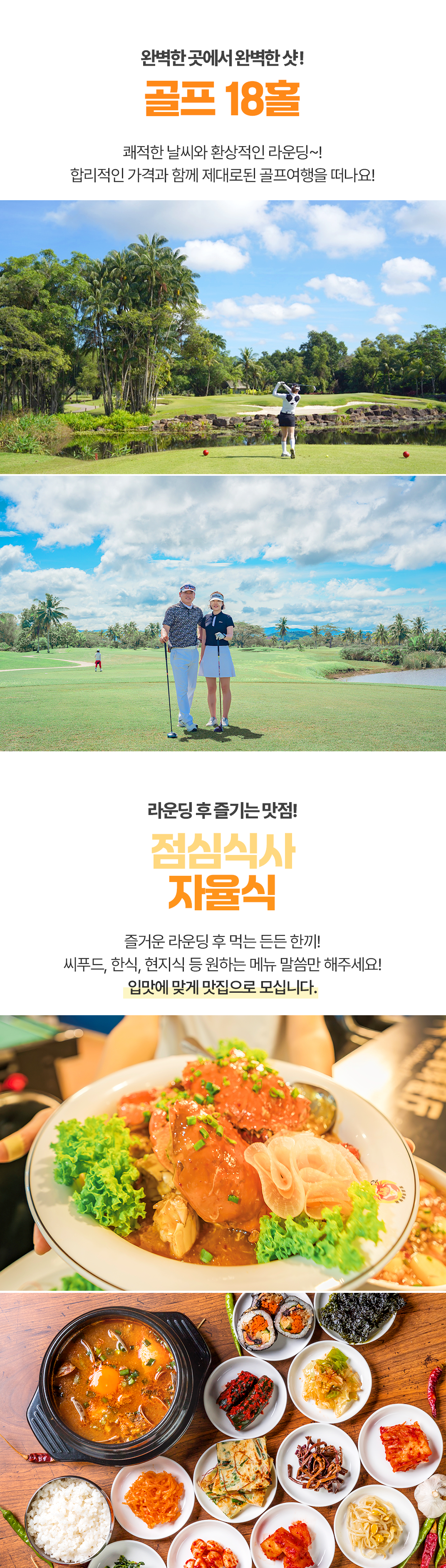 픽업(07:30) → 골프 18홀+점심식사(자율식) → 전신마사지 90분 → 선셋투어 → 저녁식사(자율식) → 숙소 드랍(21:00)