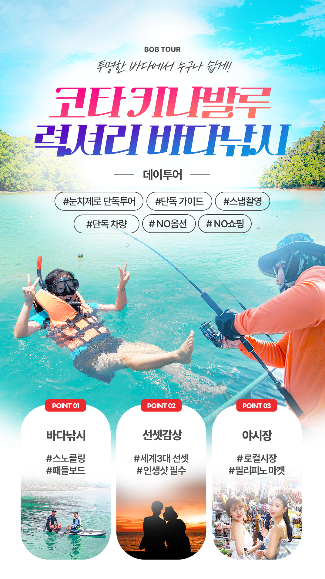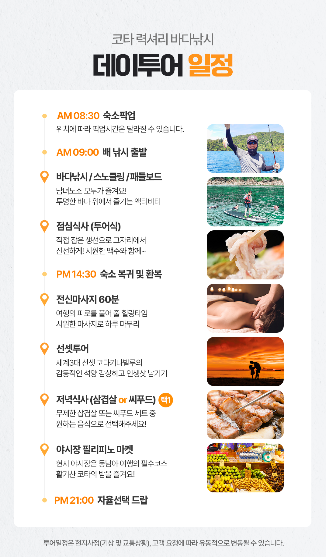 픽업(8:30) → 배 낚시 출발(9:00) → 바다낚시/스노쿨링/패들보드 + 점심식사(투어식) → 숙소 복귀 및 환복(14:30) → 전신마사지60분 → 선셋투어 → 저녁식사 → 야시장 필리피노 마켓 → 자율선택 드랍(21:00)
