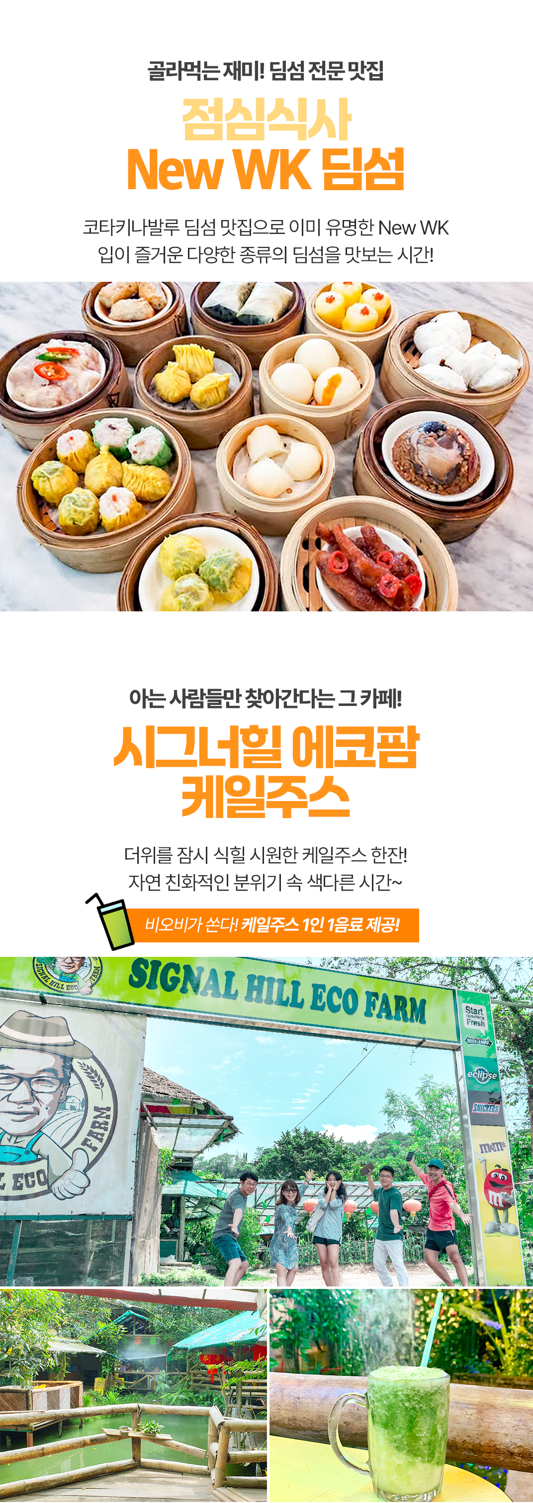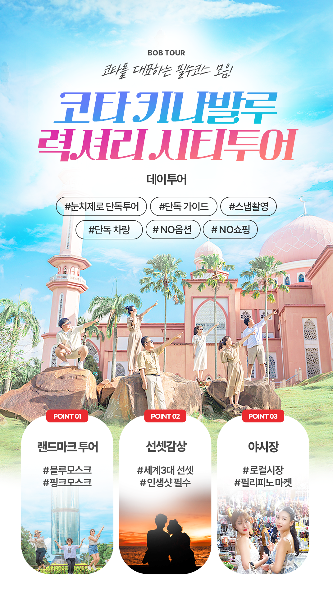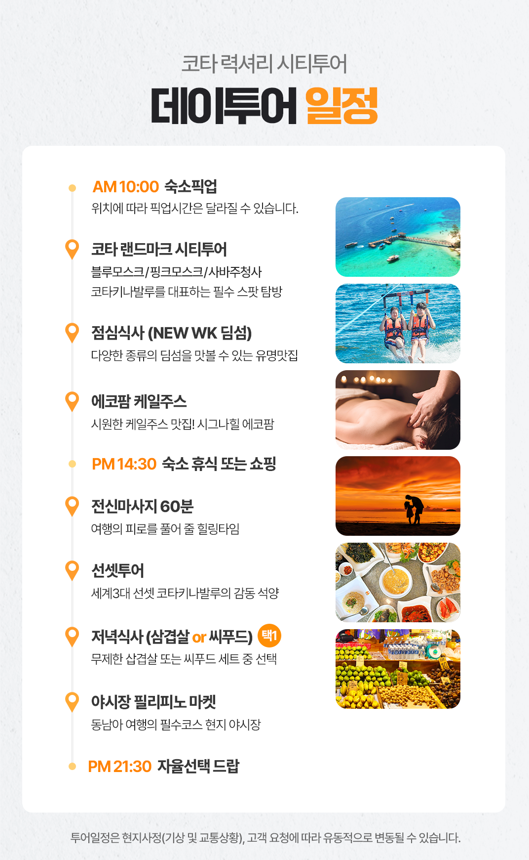 픽업(10:00) → 코타 랜드마크 시티투어+점심식사 + 에코팜 케일주스 →숙소 휴식 또는 쇼핑(14:30) → 전신마사지 60분 →선셋투어+저녁식사 → 야시장 필리피노 마켓 → 자율선택 드랍(21:30)
