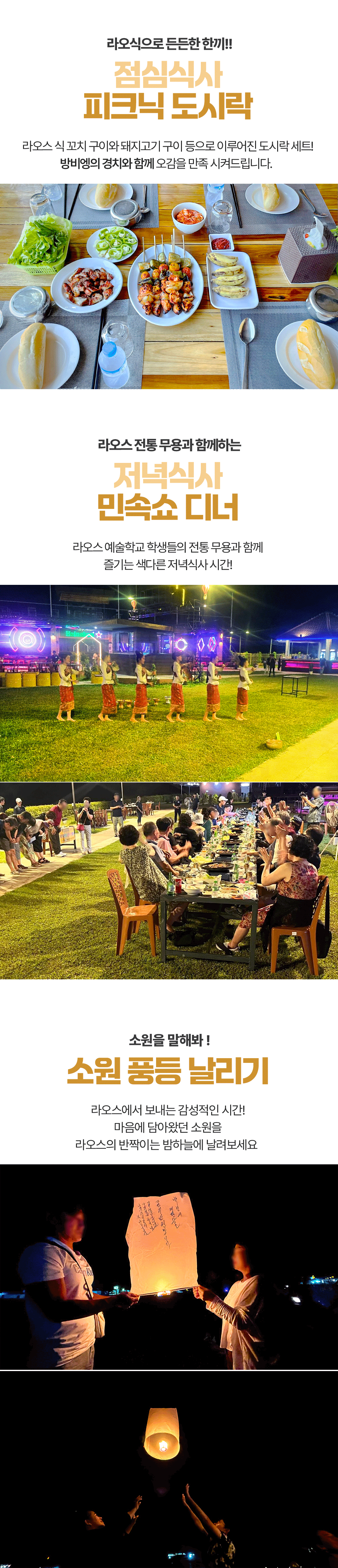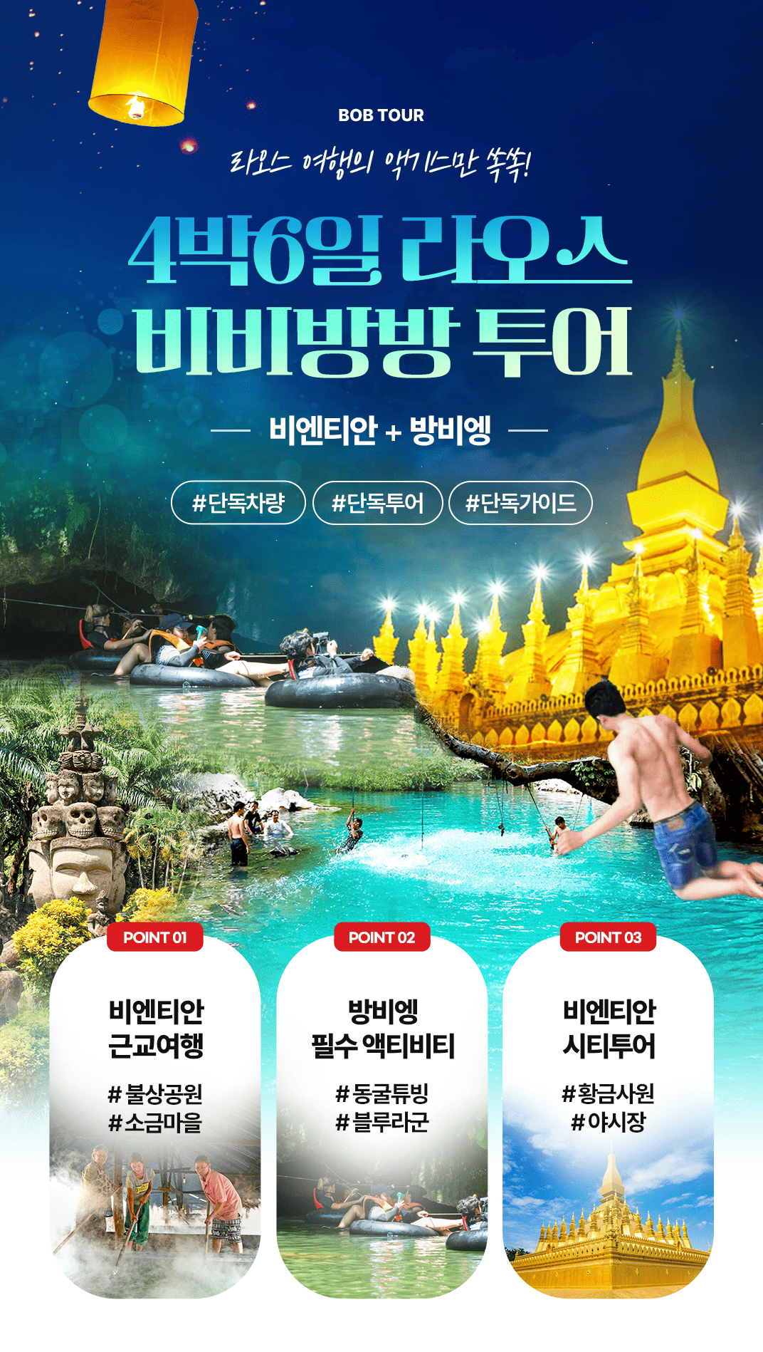 픽업(08:30) → 탐쌍 / 탐논 동굴 튜빙 → 카약킹 → 방비엥 필수 액티비티(버기카, 블루라군 1, 짚라인) → 중식 → 숙소 복귀 샤워 및 휴식 → 석식 → 소원 풍등 날리기 → 숙소드랍(20:00)