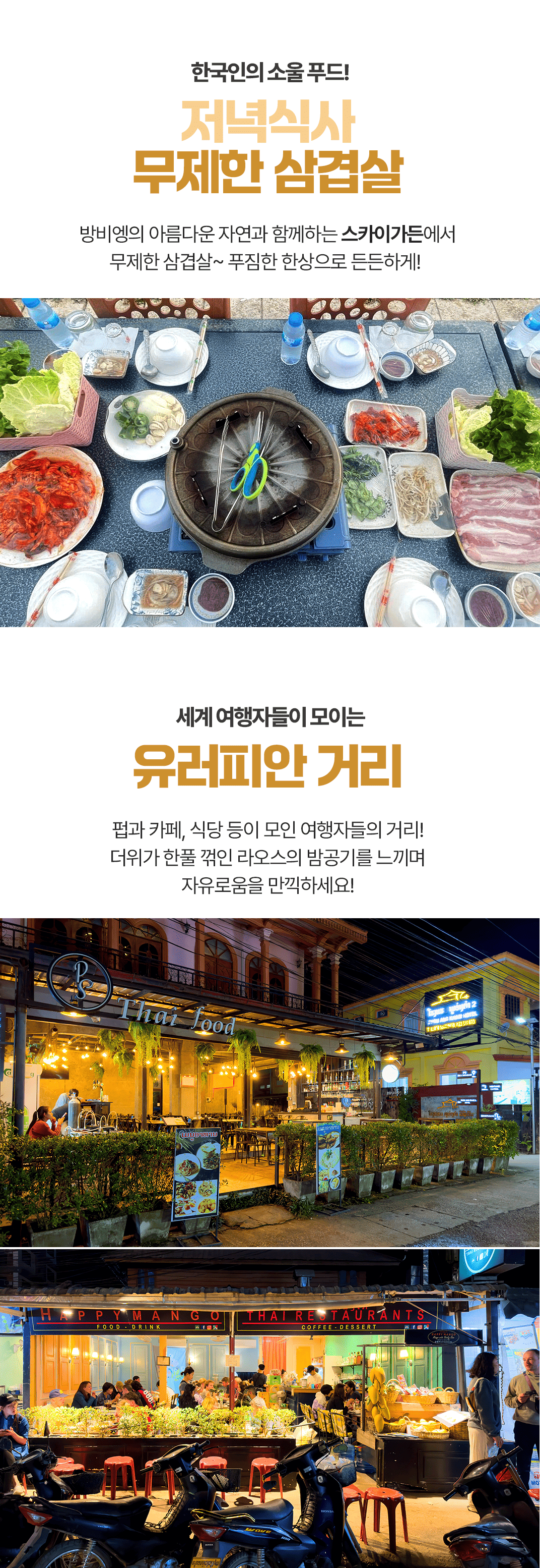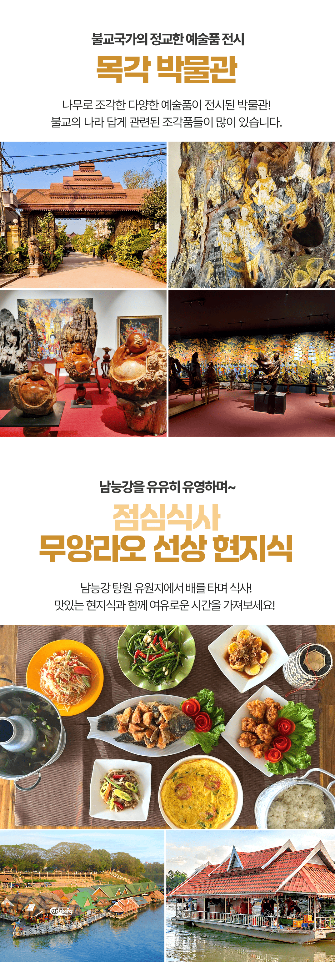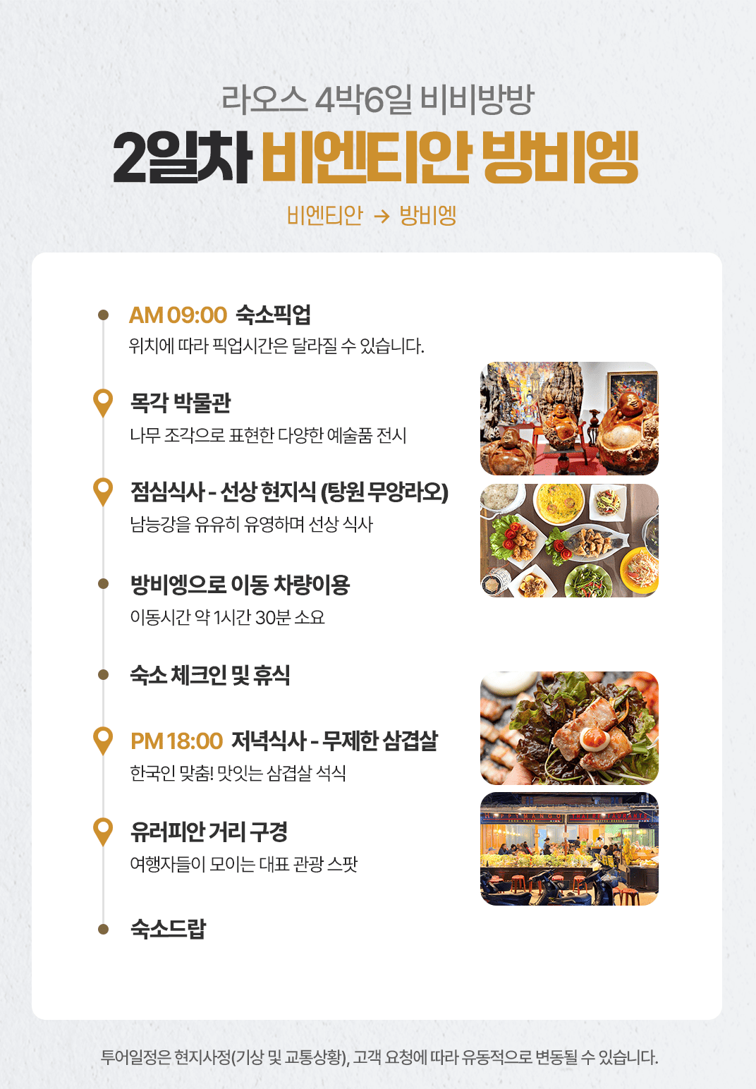 픽업(09:00) → 목각 박물관 → 중식 → 방비엥 이동(차량 약 1시간 30분) → 숙소 체크인 휴식 → 석식(18:00) → 유러피안 거리 구경 후 숙소드랍
