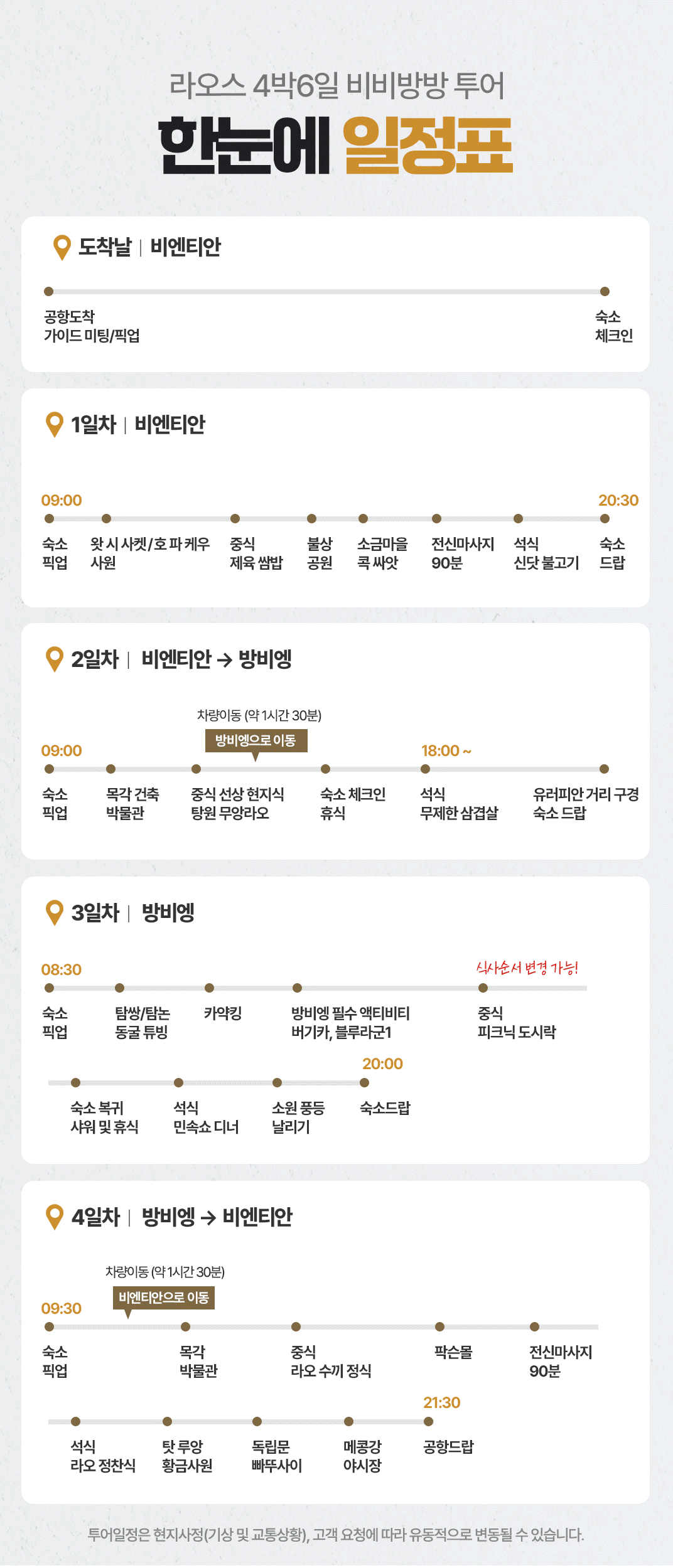 픽업(08:30) → 비엔티안 이동(차량 약 2시간) → 목각 박물관 → 중식 → 왓 시 사켓 / 호 파 케우 사원 → 팍슨몰 → 전신마사지 90분 → 석식 → 탓 루앙 사원(황금사원) → 독립문 빠뚜사이 → 메콩강 야시장 → 공항드랍(21:30)