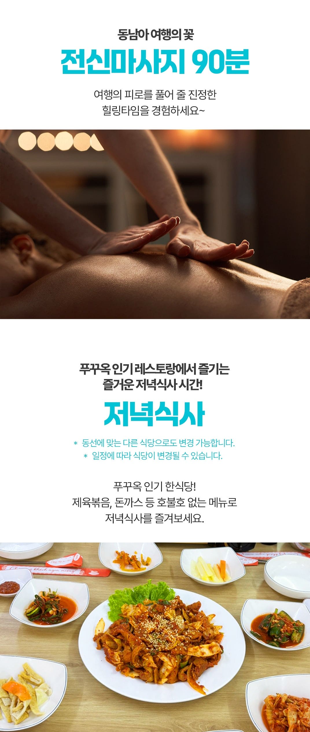 픽업(11:30) → 점심식사 → 쭈온쭈온푸꾸옥→ 자유일정 (코코넛 수용소 & 후추농장/진주농장/킹콩마트 중 원하는 일정)→ 전신 마사지 90분→ 저녁식사→ 야시장→ 공항드랍(21:00)