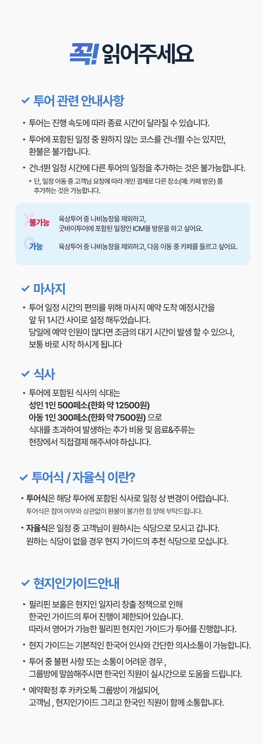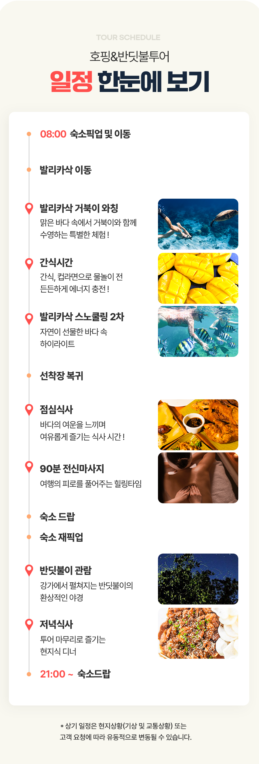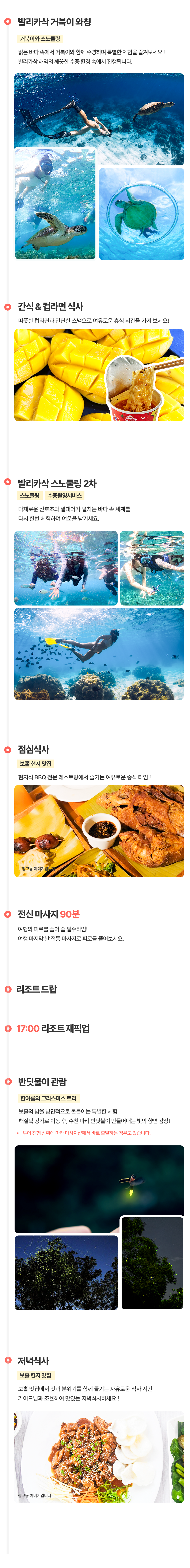 픽업(09:00PM) → 발리카삭 거북이 와칭 → 컵라면 & 망고 간식 서비스 → 열대어스노쿨링 → 점심 식사 → 90분 전신 마사지 → 반딧불투어 → 저녁식사 →리조트 드랍