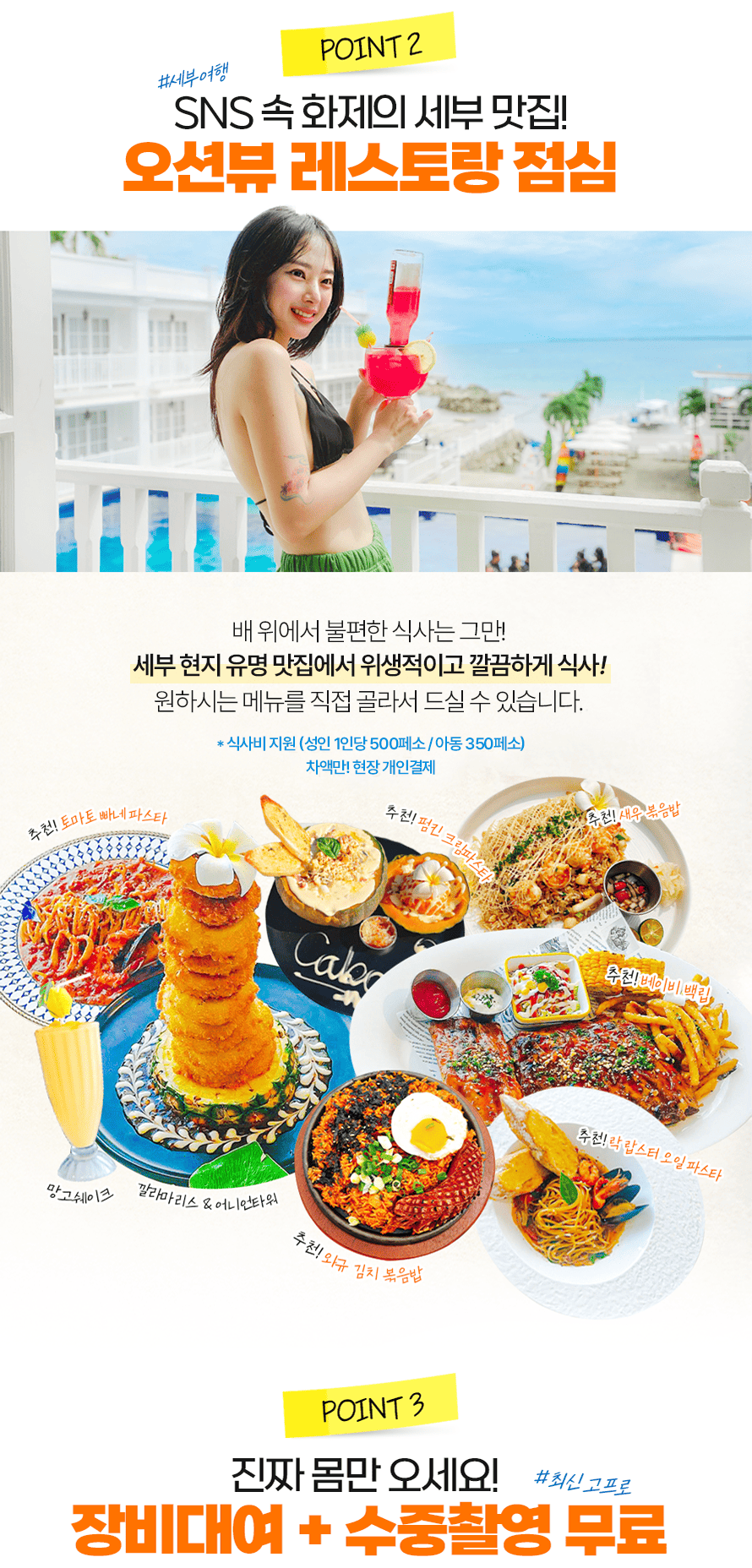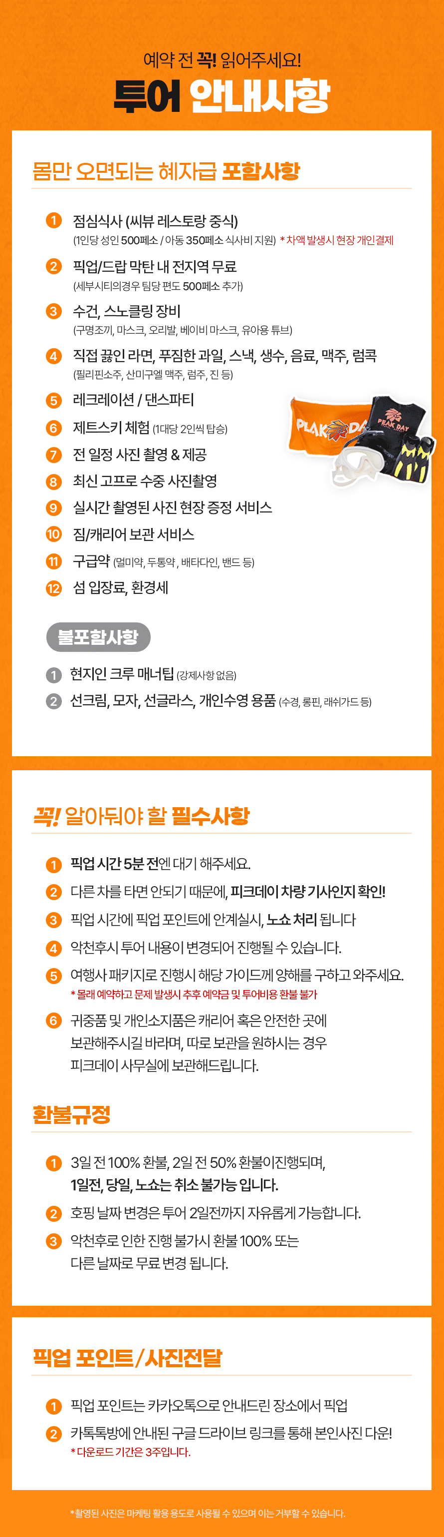픽업(10:00~11:00) → 씨뷰 레스토랑 중식(11:00~11:40)→ 캐리비안 비치, 포토타임 및 자유시간, 해양액티비티 현장 추가 가능(11:40~13:30) → 1차 스노클링 - 산비센테(13:30~14:30) → 2차스노클링 - 힐룽뚱안, 제트스키체험, 체험다이빙(신청자에 한함) (14:30~!16:30) → 줄 낚시 체험 및 선상라면(16:30~16:50) → 선상파티 및 선착장 복귀(17:30)