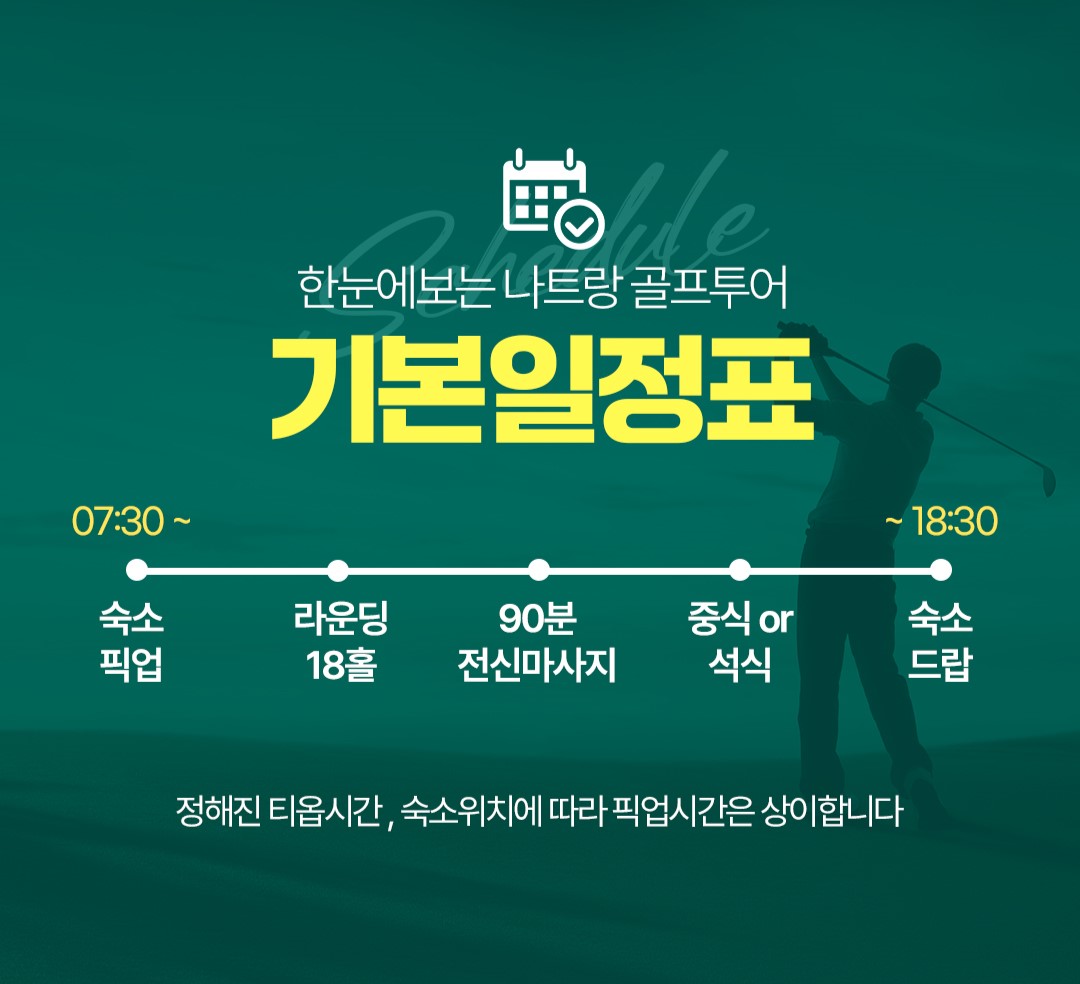 07:30 픽업→09:00~13:30 라운딩→13:30~15:30 마사지→15:30~17:00 석식→ 17:00 숙소 드랍