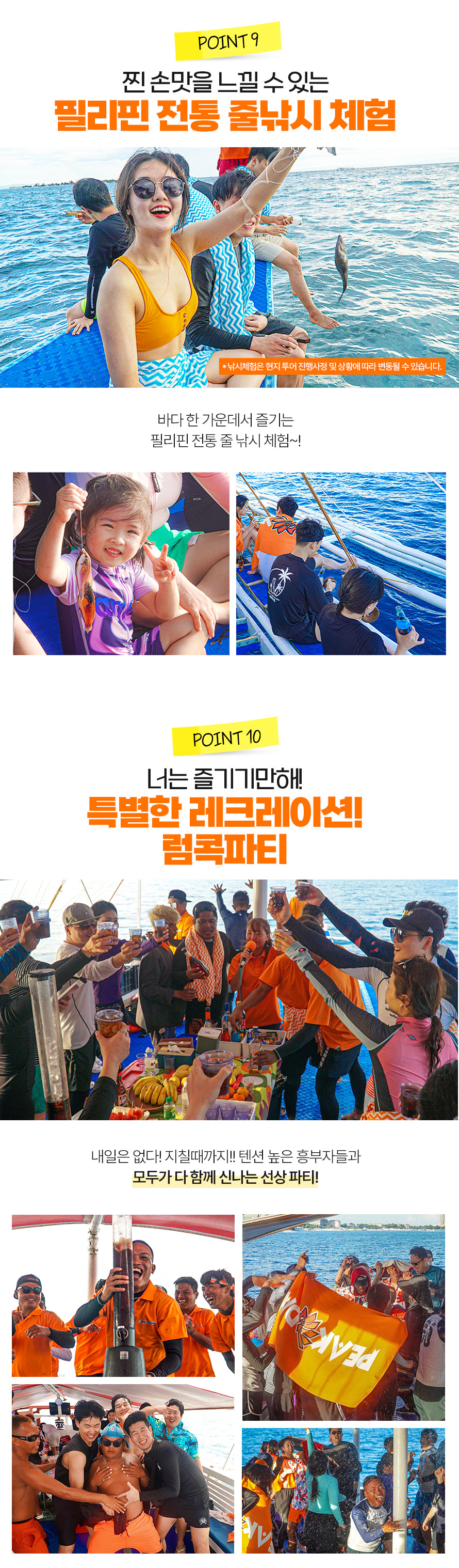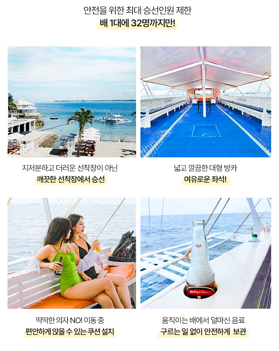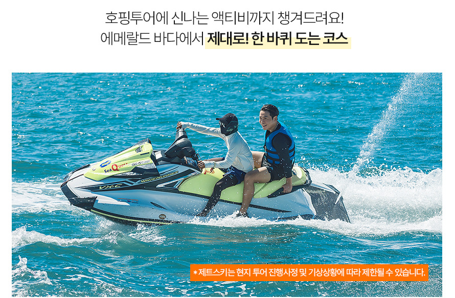 10:00~11:00 픽업 → 11:00~11:40 씨뷰 레스토랑 중식→ 12:00~17:30 캐러비안 비치 입도 포토타임 및 자유시간 / 1차 스노클링 - 산비센테 / 2차스노클링 - 힐룽뚱안, 제트스키체험, 체험다이빙(신청자에 한함) / 줄 낚시 체험 및 선상라면 / 선상 파티 → 17:30 선착장 복귀 → 17:30~19:30 샤워&전신마사지 90분 → 19:30~21:00 더코브 맛집 저녁식사 → 22:00~23:00 공항드랍