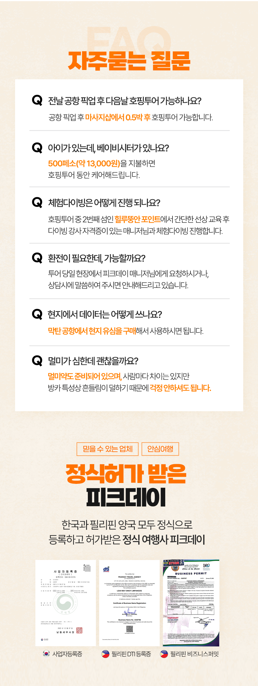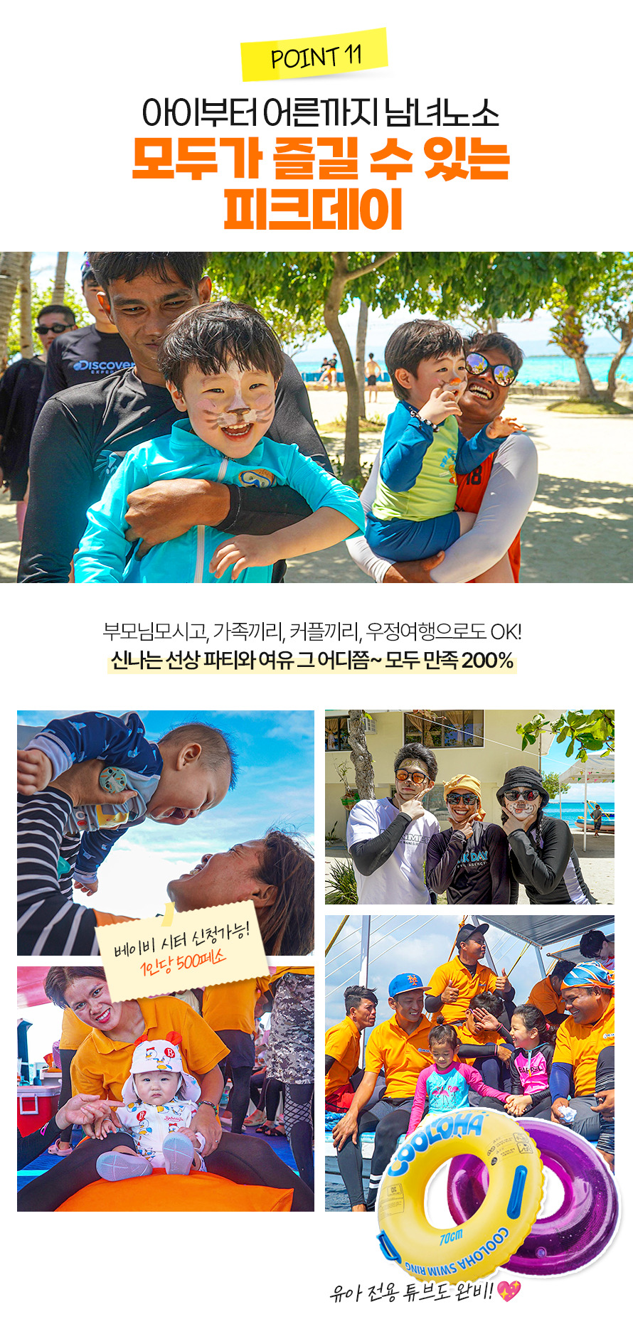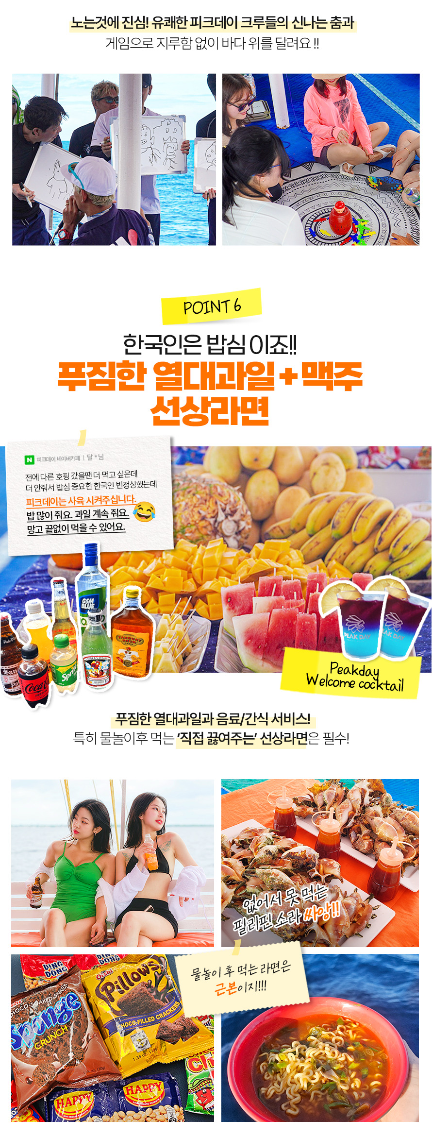 10:00~11:00 픽업 → 11:00~11:40 씨뷰 레스토랑 중식→ 12:00~17:30 캐러비안 비치 입도 포토타임 및 자유시간 / 1차 스노클링 - 산비센테 / 2차스노클링 - 힐룽뚱안, 제트스키체험, 체험다이빙(신청자에 한함) / 줄 낚시 체험 및 선상라면 / 선상 파티 → 17:30 선착장 복귀 → 17:30~19:30 샤워&전신마사지 90분 → 19:30~21:00 더코브 맛집 저녁식사 → 22:00~23:00 공항드랍