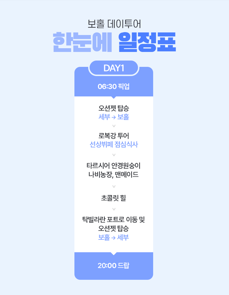 픽업(06:30) → 오션젯 탑승 후 보홀로 이동 → 로복강 투어 선상뷔페 점심식사 → 타르시어 안경원숭이, 나비농장, 맨메이드 → 초콜릿 힐 → 탁빌라란 포트로 이동 및 오션젯 탑승 → 세부로 이동 후 리조트 드랍(20:00)