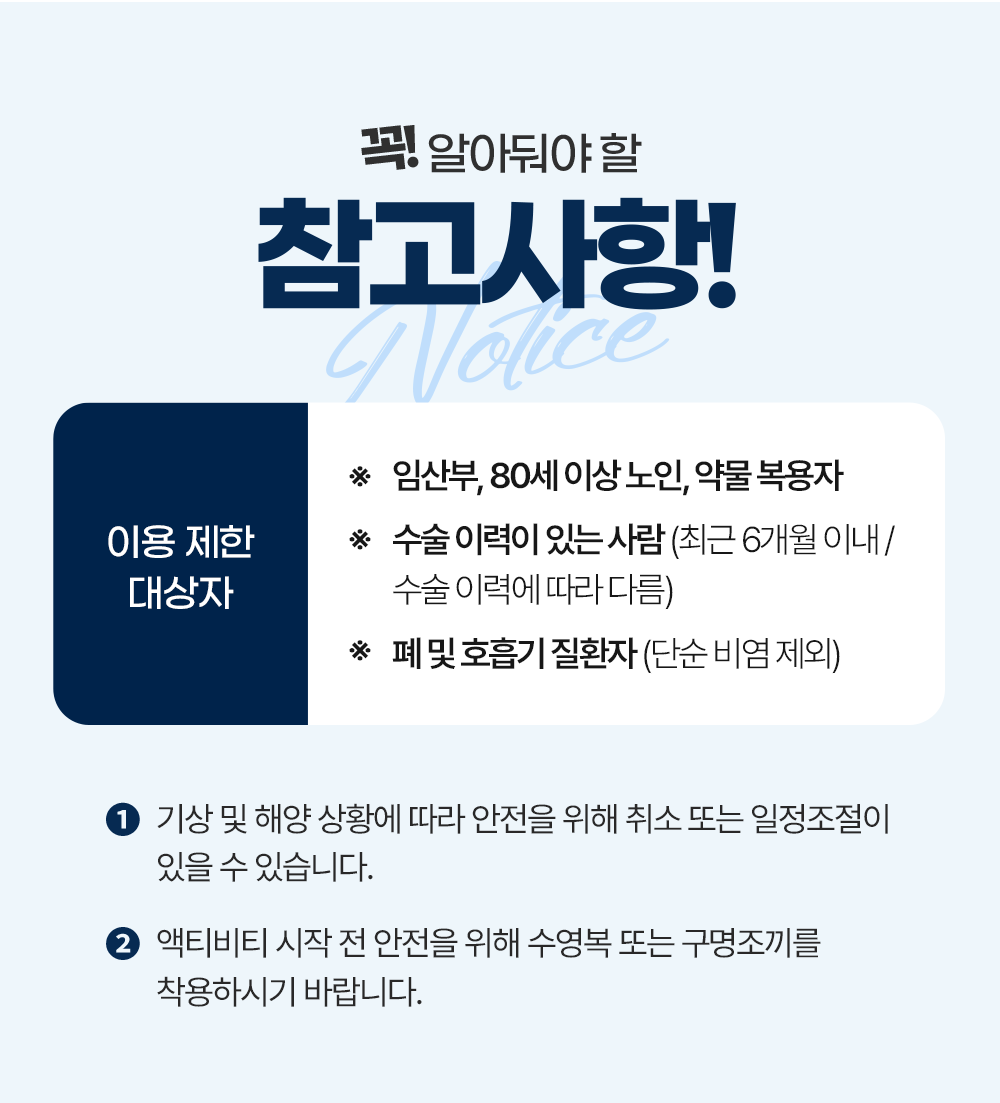 * 기상 및 해양 상황에 따라 안전을 위해 취소 또는 일정 조절이 있을 수 있습니다.