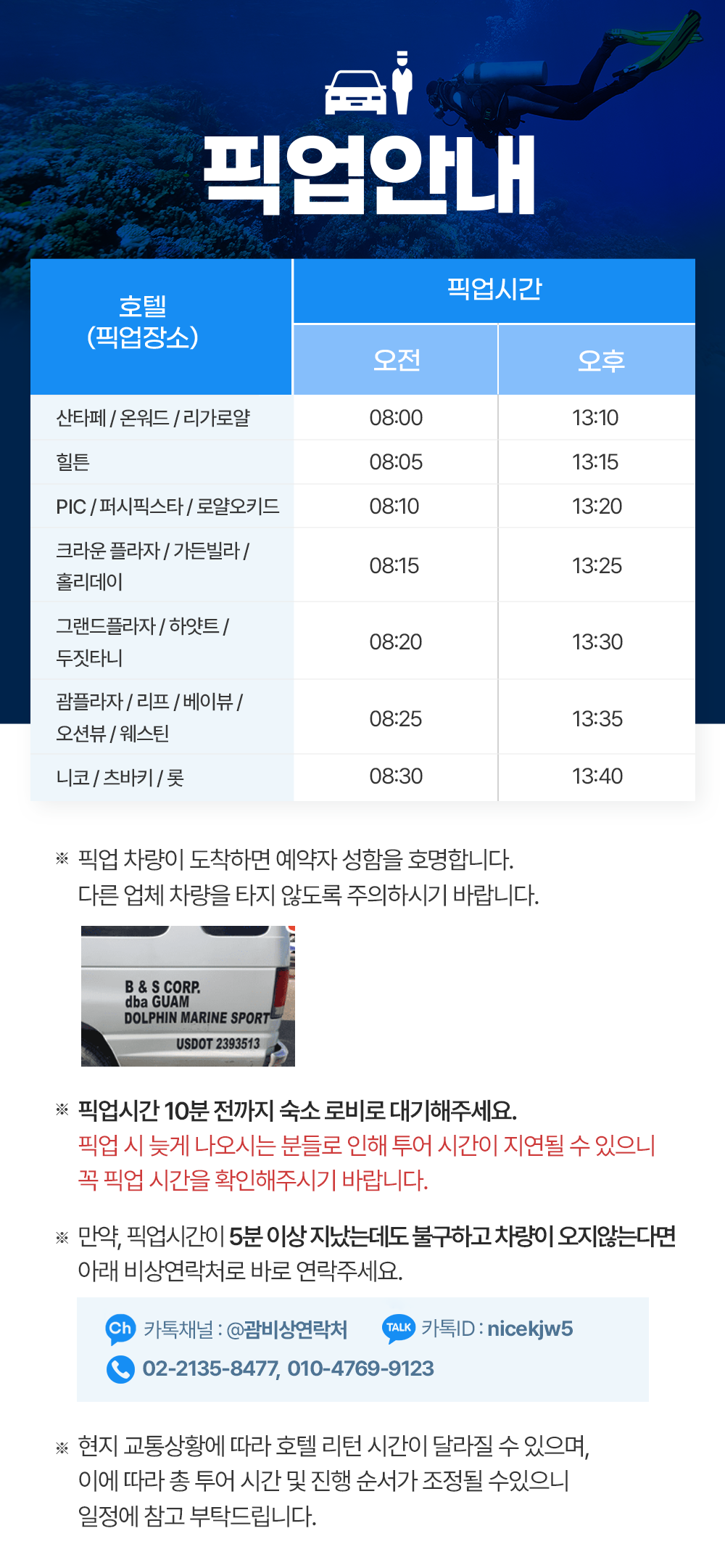 * 픽업 시간 5분 전까지 숙소 로비로 대기해주세요.