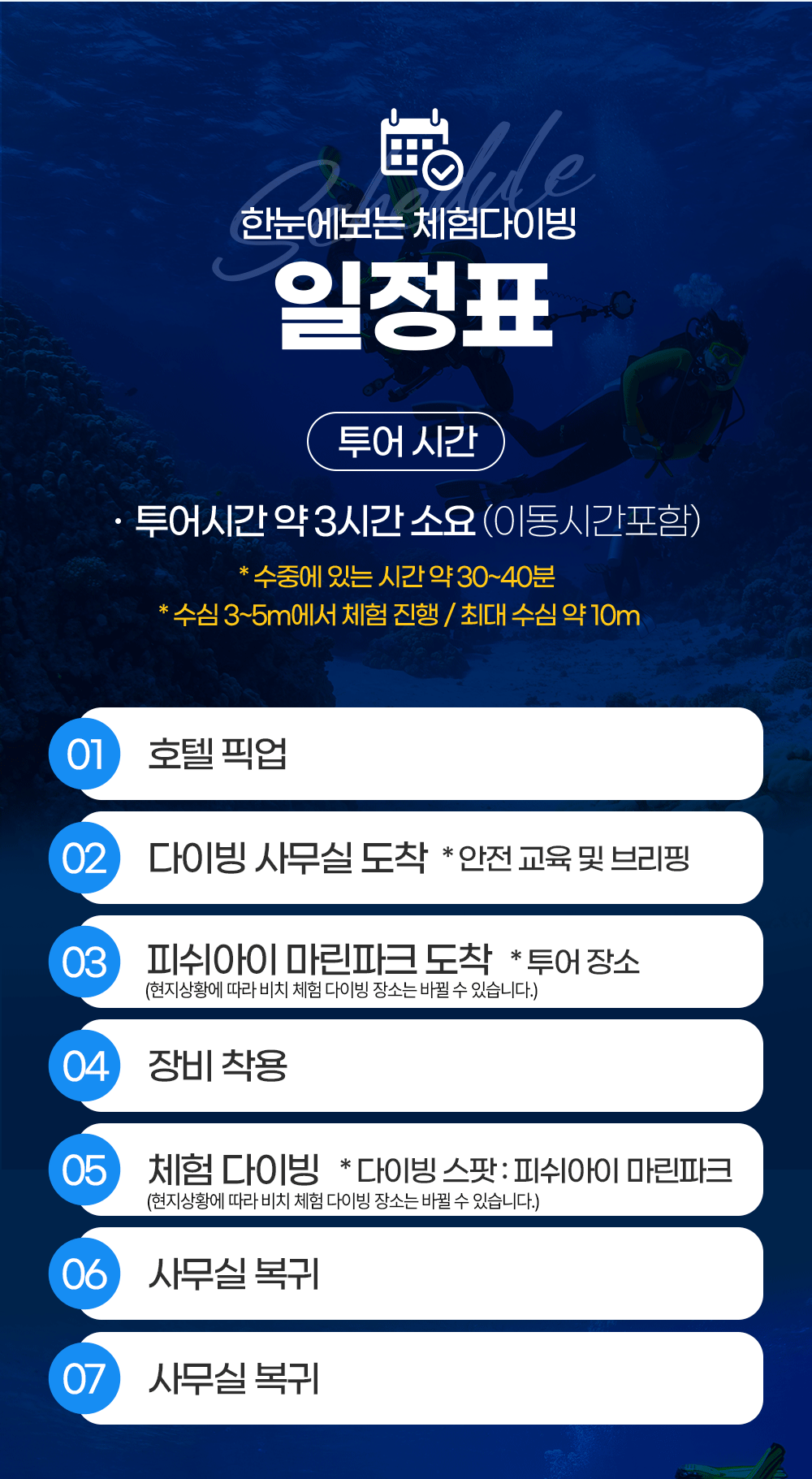픽업 → 다이빙 교육 → 체험다이빙(피쉬아이 마린 파크) → 호텔드랍