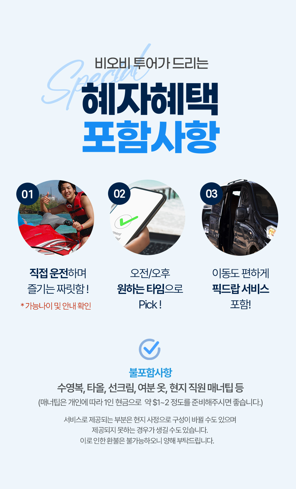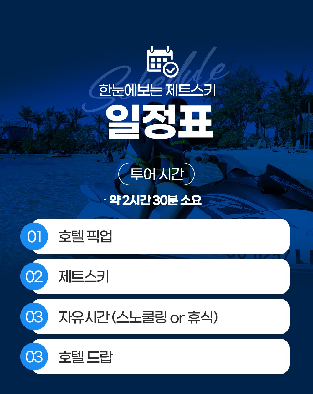 픽업 → 제트스키 → 자유시간(스노쿨링 OR 휴식) → 호텔드랍