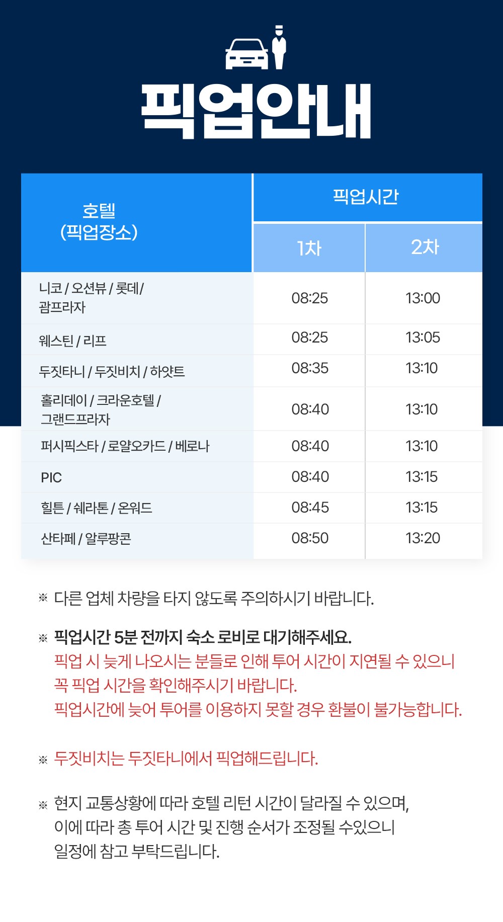 * 픽업 시간 10분 전까지 숙소 로비로 대기해주세요.