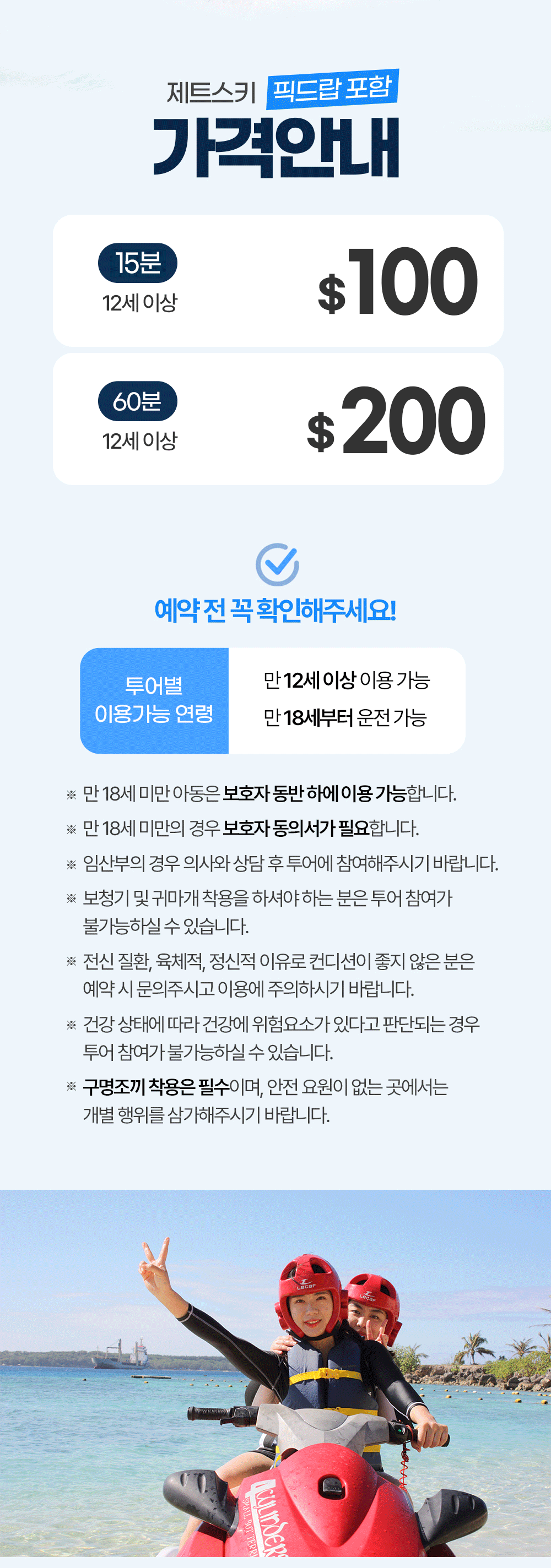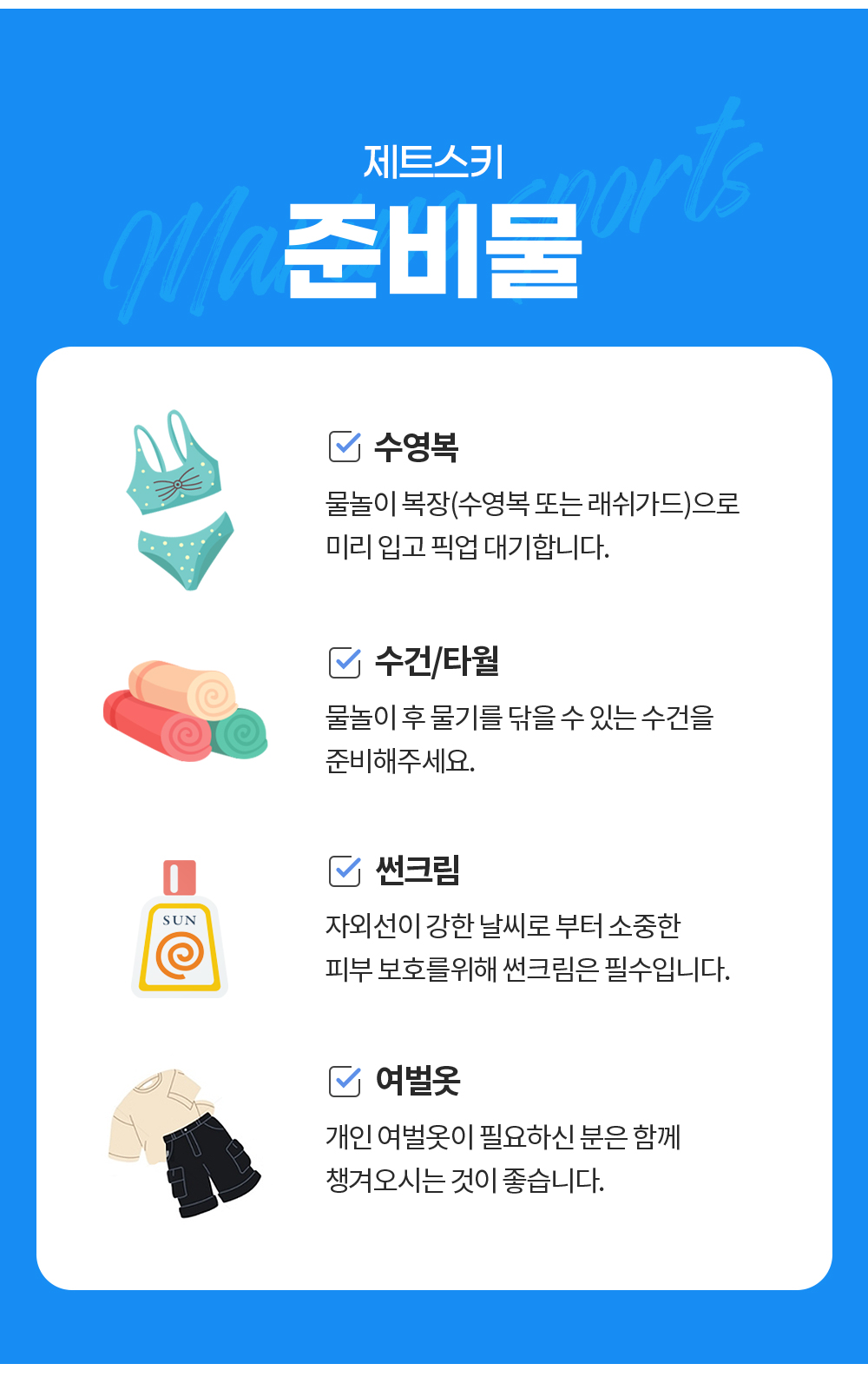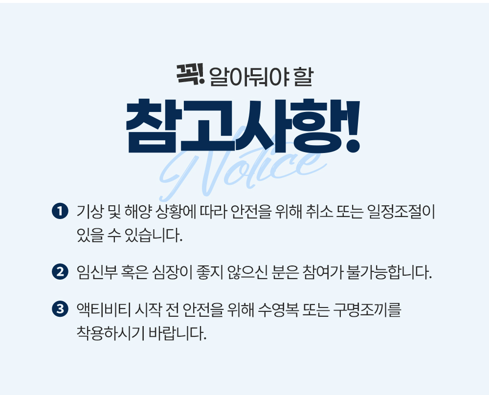 * 액티비티 시작 전 안전을 위해 수영복 또는 구명조끼를 착용하시기 바랍니다.