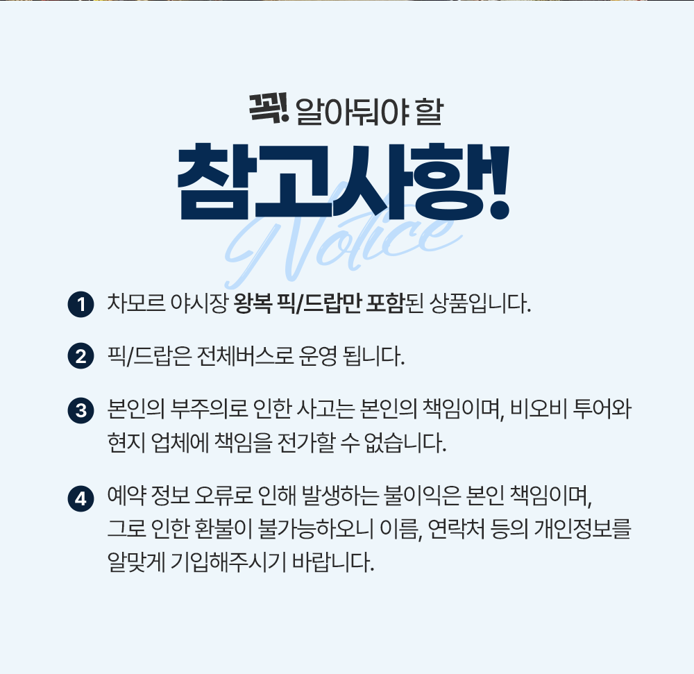 현지 교통상황에 따라 호텔 리턴 시간이 달라질 수 있으며, 이에 따라 총 투어 시간 및 진행 순서가 조정 될 수 있습니다.