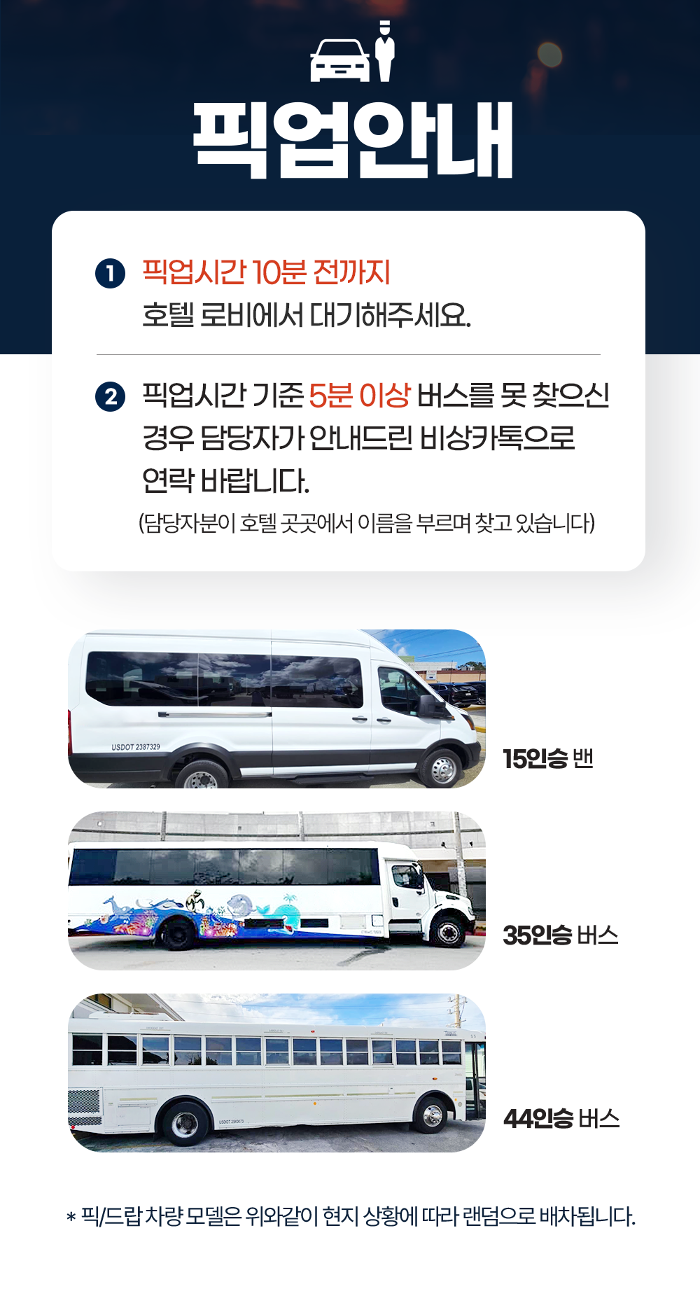 * 픽업 시간 10분 전까지 숙소 로비로 대기해주세요.