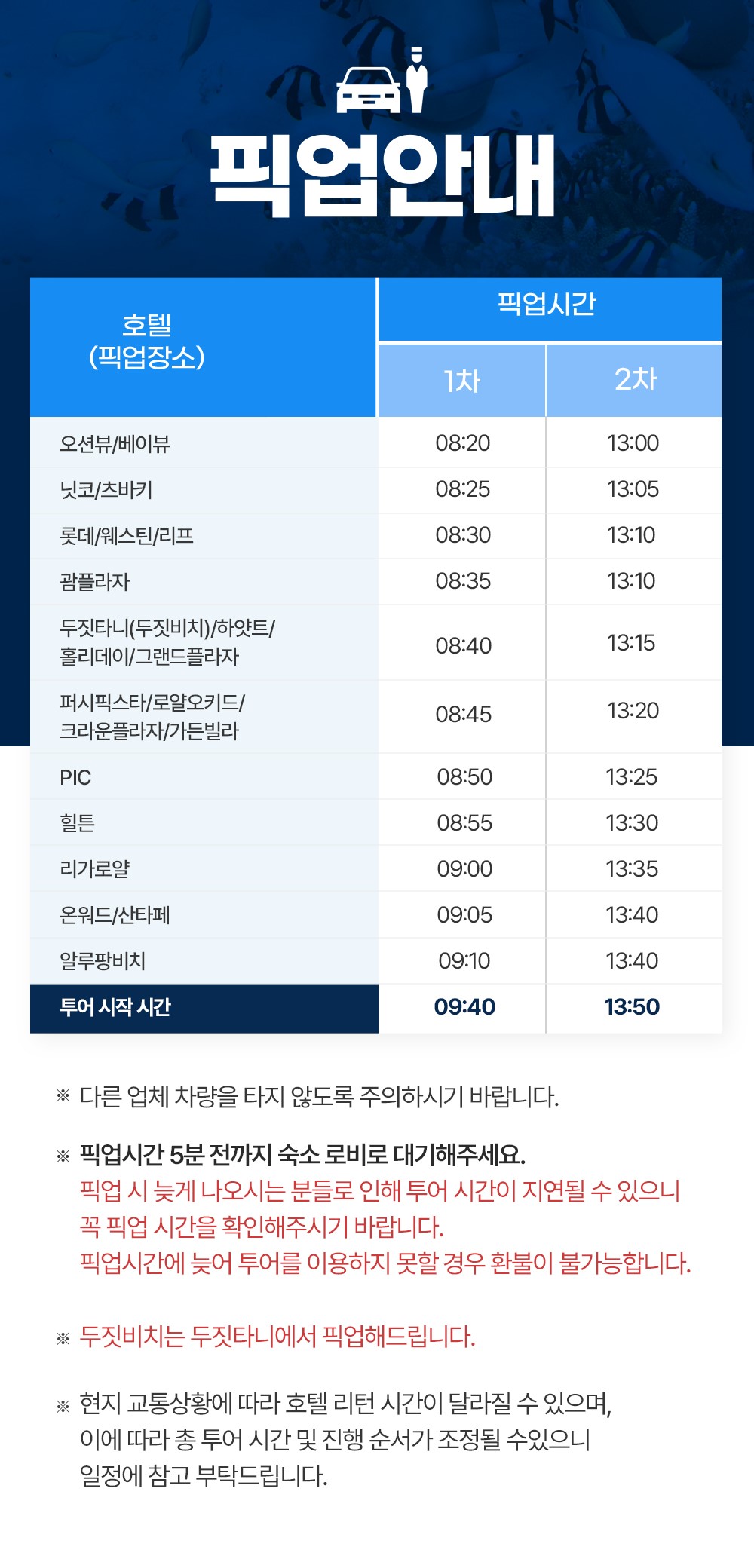 * 픽업 시간 10분 전까지 숙소 로비로 대기해주세요.
