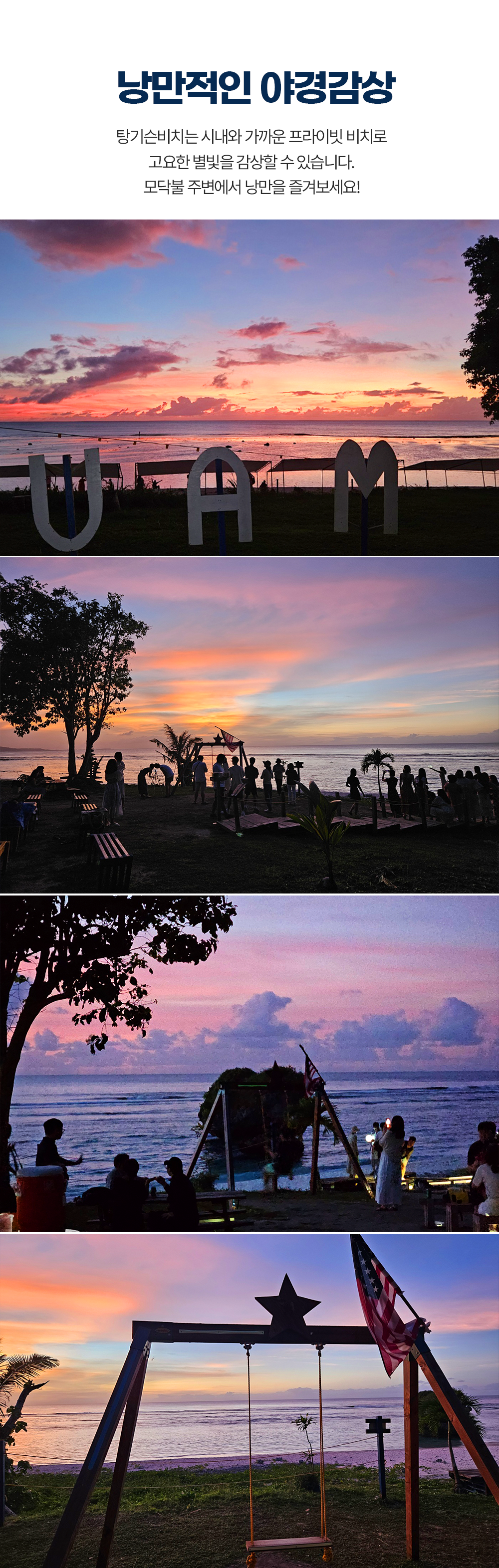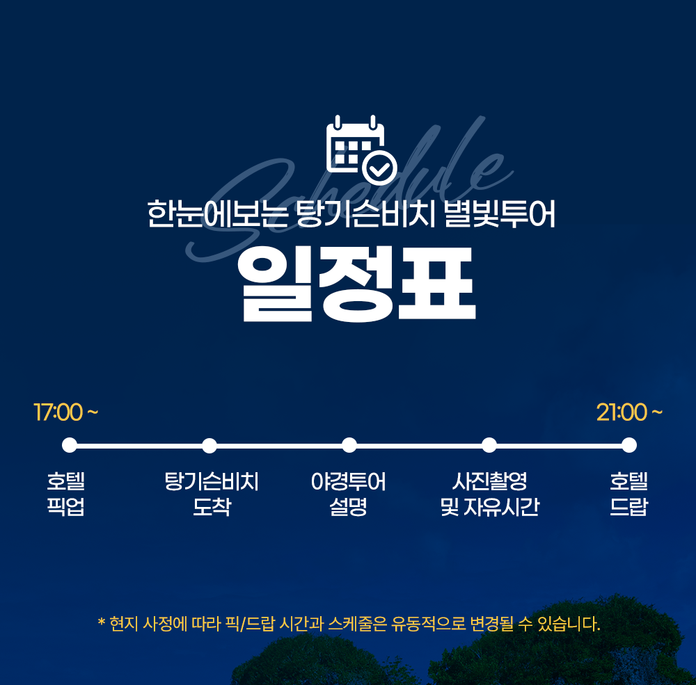 호텔 픽업(17:00) → 탕기슨 비치 도착 → 야경투어 설명 → 사진 촬영 및 자유시간 → 호텔드랍(21:00)