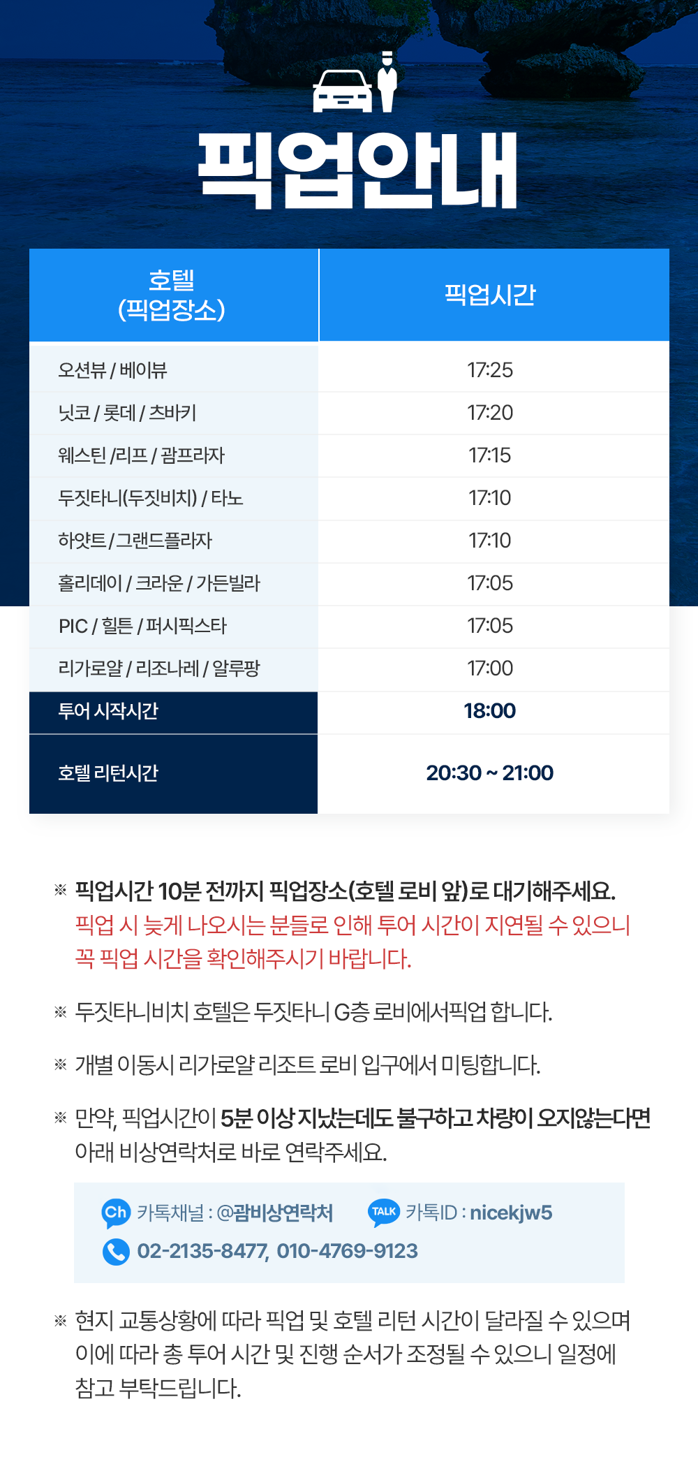 * 픽업 시간 10분 전까지 숙소 로비로 대기해주세요.