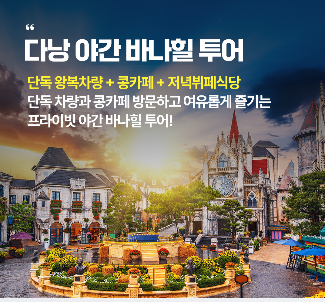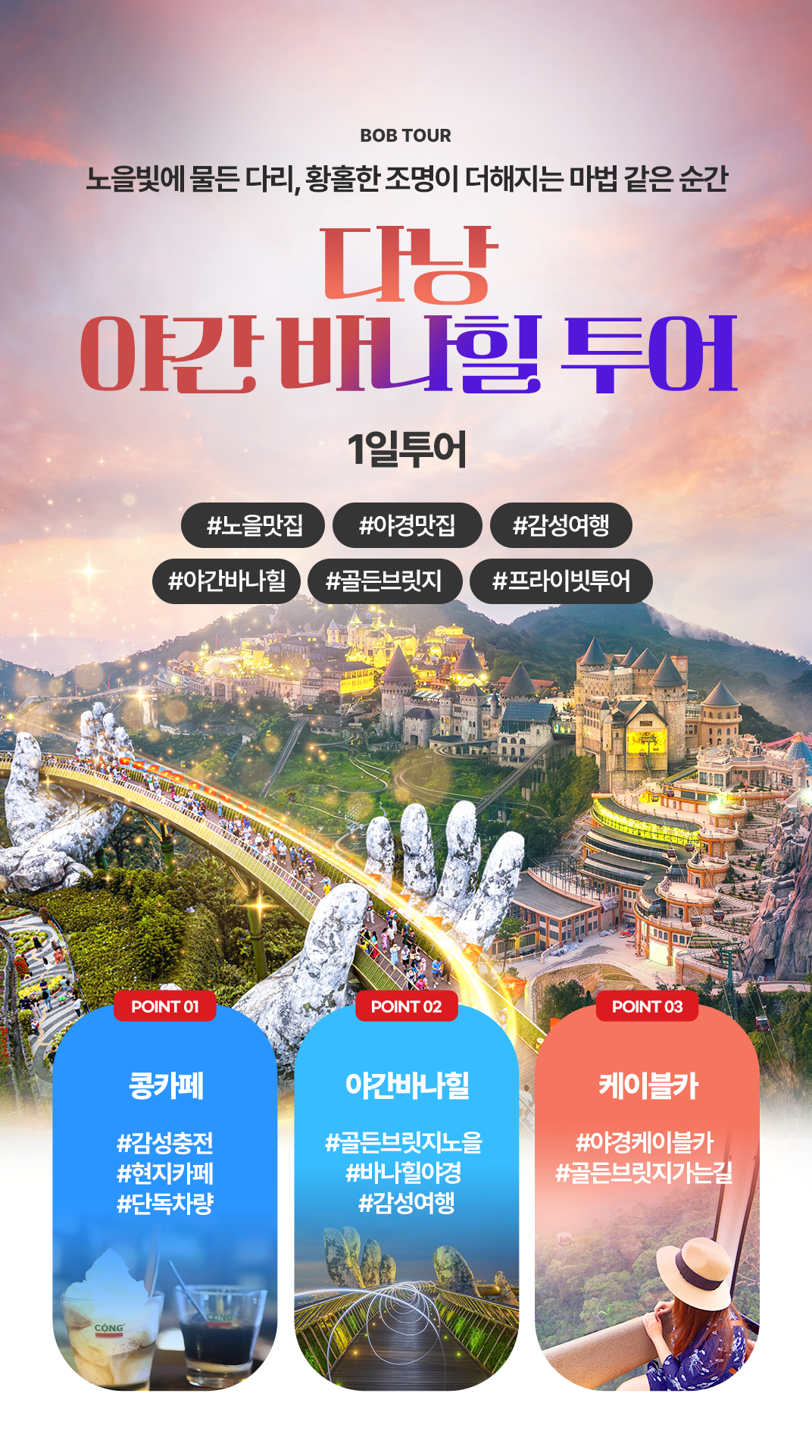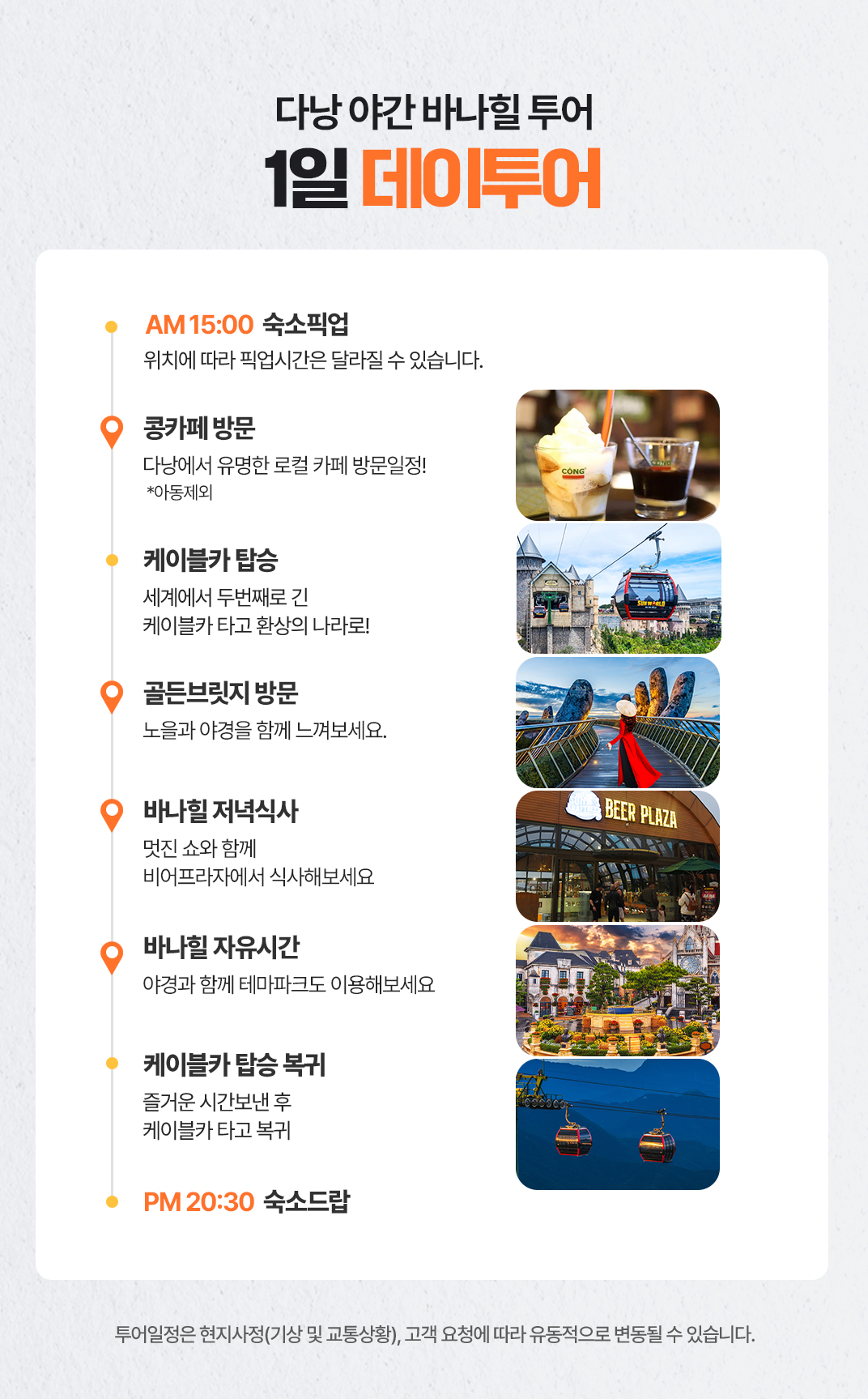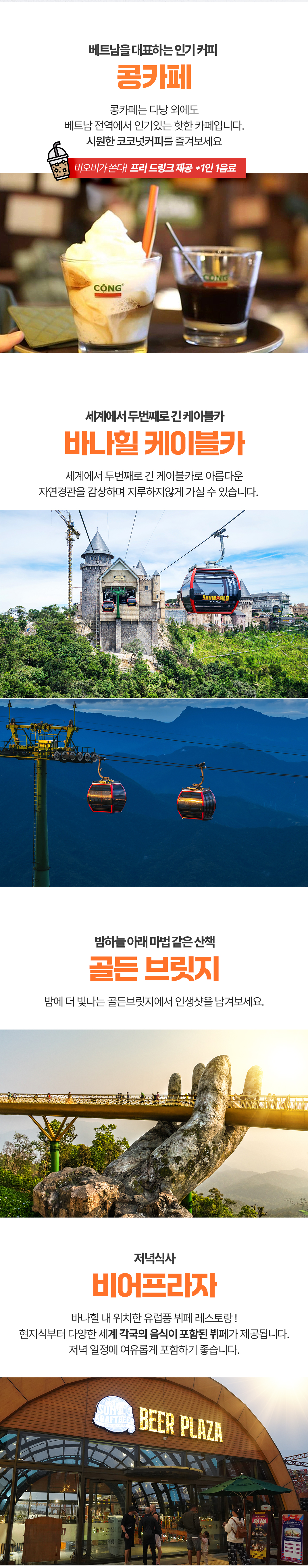 픽업(15:00) → 콩카페 방문→ 케이블카 탑승후 이동 → 골든브릿지 방문 → 바나힐 저녁식사→ 바나힐 자유시간→ 케이블카 탑승 복귀 → 숙소 드랍