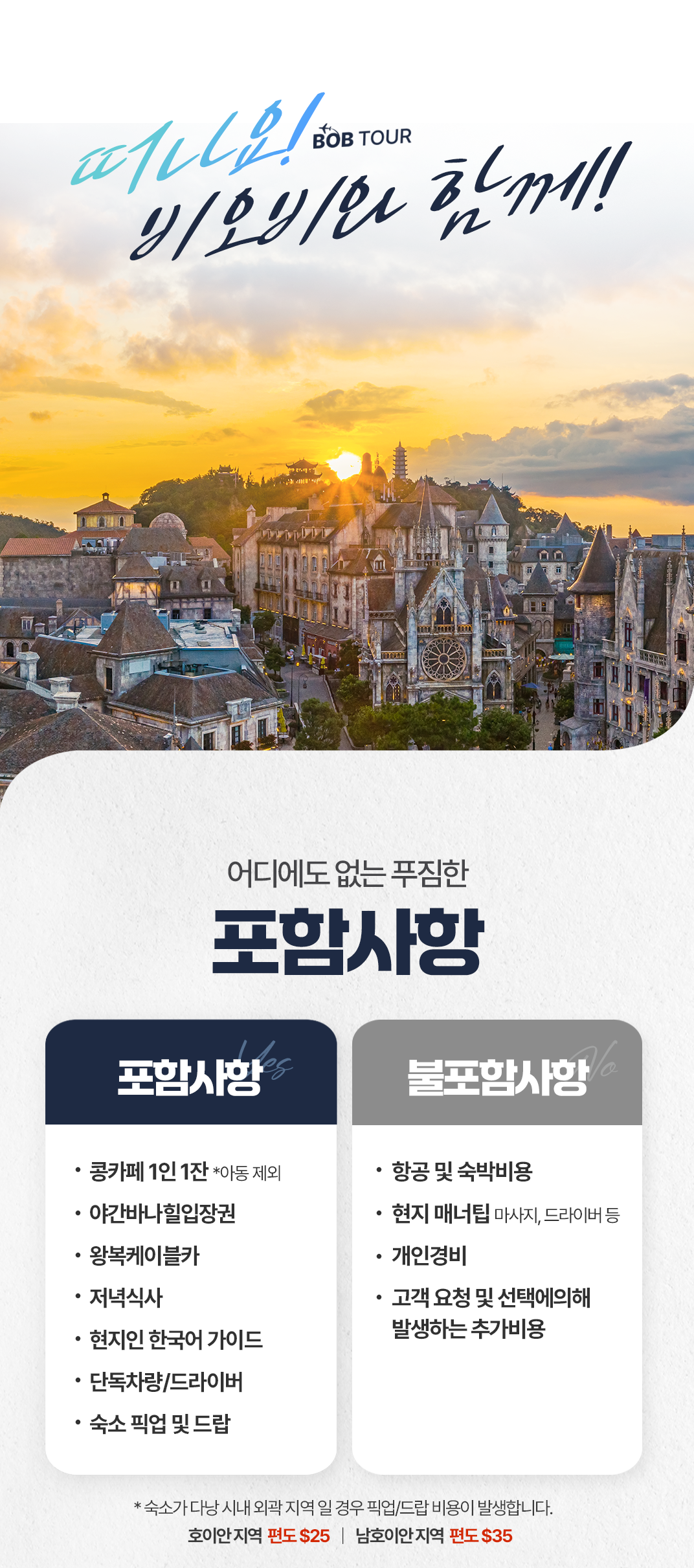 - 숙소가 다낭시내 외곽지역 일 경우 추가비용(호이안지역 편도 $25 / 남호안 지역 편도 $35)