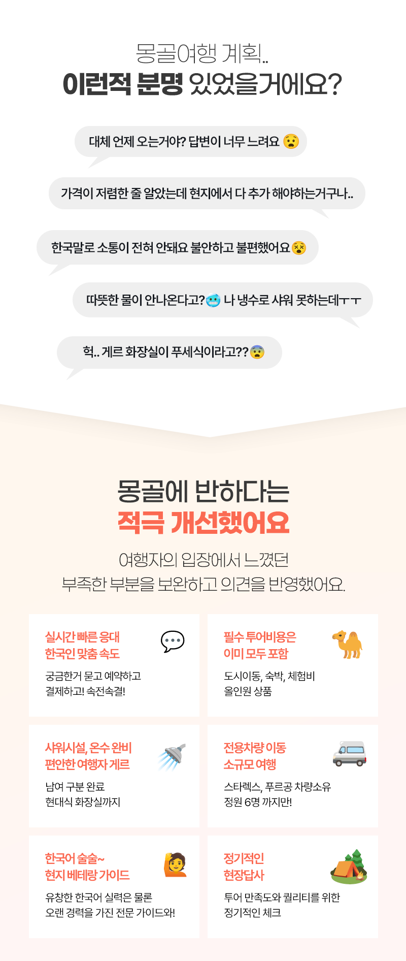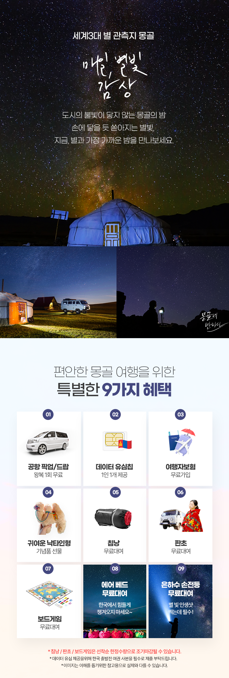 * 조식/중식/석식 : 게르 캠프 식당에서 식사를 준비해드리며 중식은 주로 이동 중 외부식당 식사 또는 가이드님이 직접 요리 합니다.
