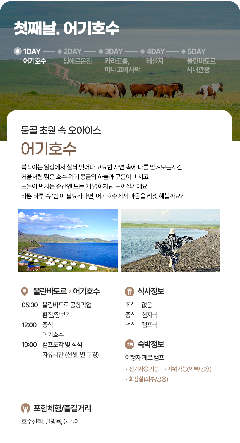 공항 픽업(05:00) → 환전 및 마트 장보기 → 중식(현지식) → 어기호수 → 캠프도착 및 자유시간 → 석식(캠프식) → 자유시간 (선셋 및 별구경)