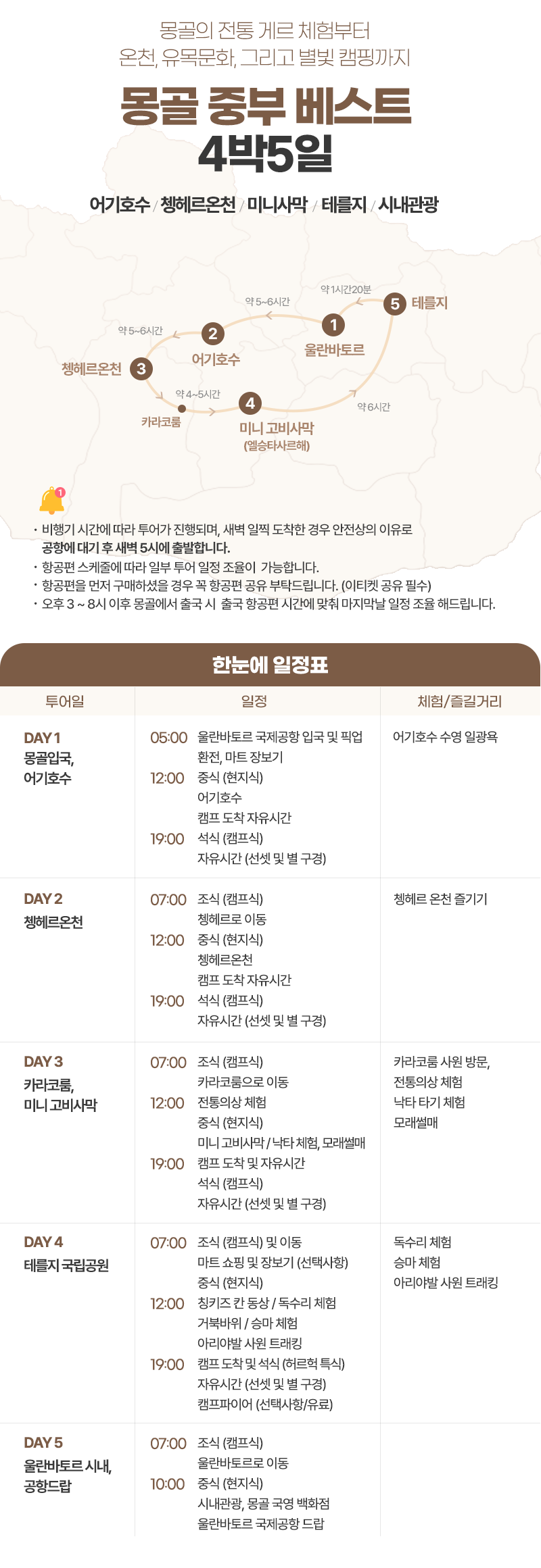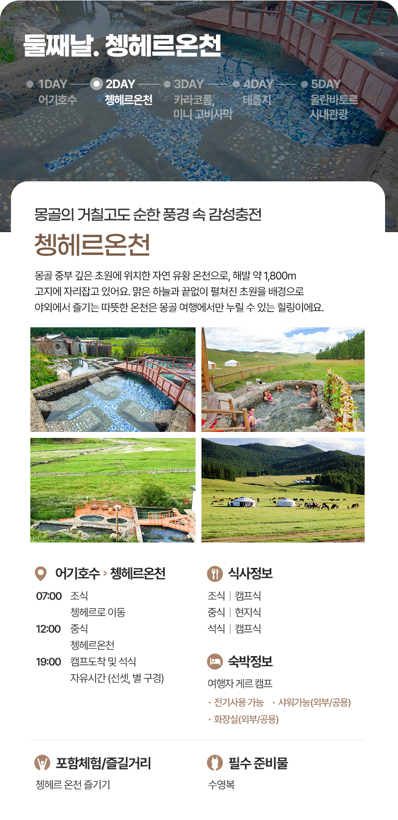 조식(07:00) → 쳉헤르 이동 → 중식(현지식) → 쳉헤르온천 → 캠프도착 및 자유시간 → 석식(캠프식) → 자유시간 (선셋 및 별구경)