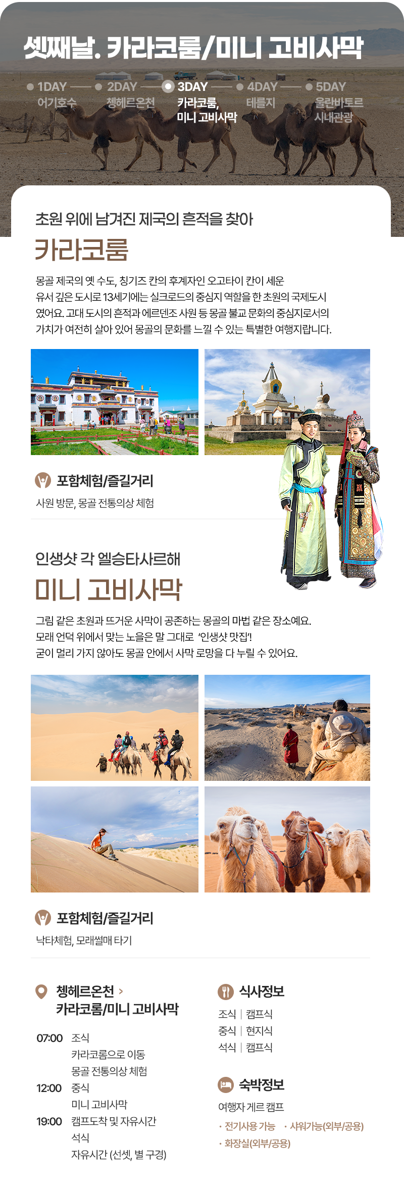 조식(07:00) → 카라코룸으로 이동 → 사원방문, 전통의상 체험 → 중식(현지식) → 미니 고비사막 → 캠프 도착 및 자유시간 → 석식(캠프식) → 자유시간 (선셋 및 별구경)