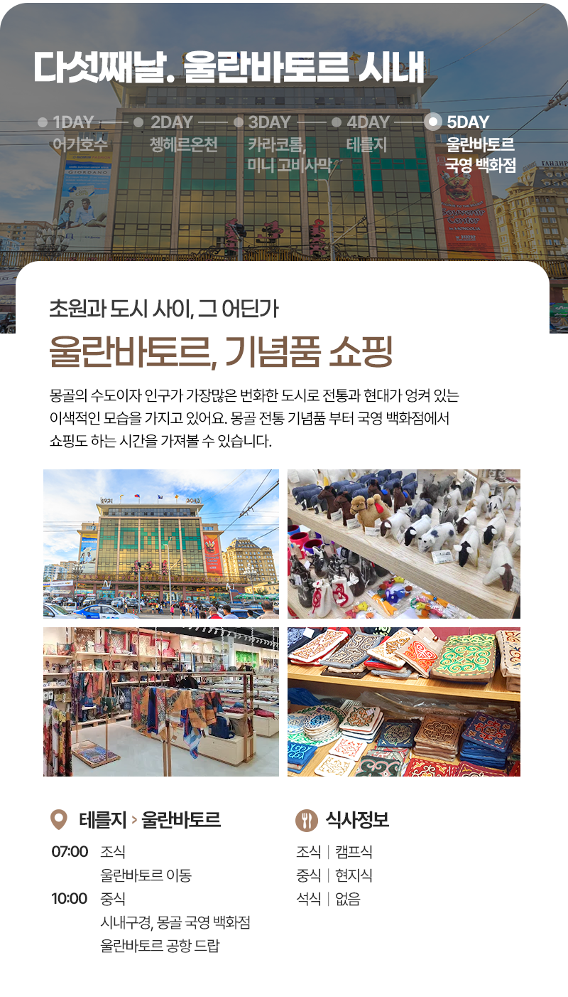 조식(07:00) → 울란바토르로 이동 → 중식(현지식) → 시내관광, 몽골 국영 백화점 → 울란바토르 국제공항 드랍 → 한국도착