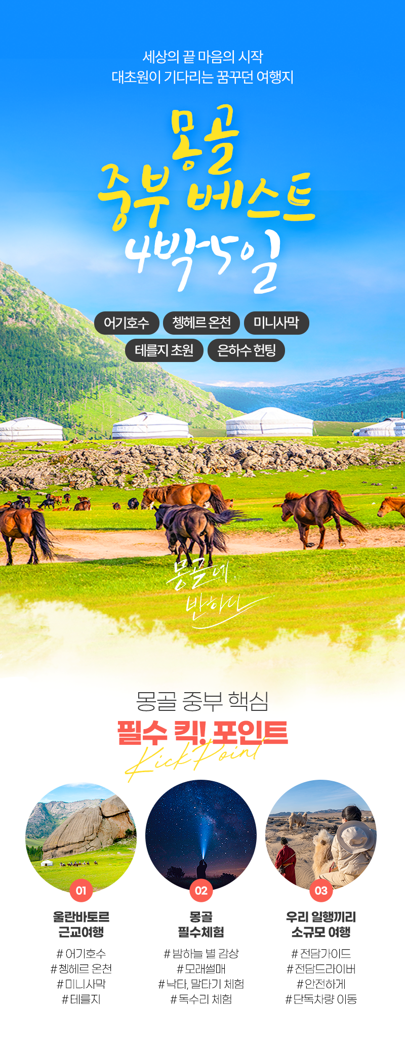 * 테를지특식 : 허르헉 + 한국식 8종반찬(석식) 1회제공됩니다. 테를지 일정에서만 제공됩니다.