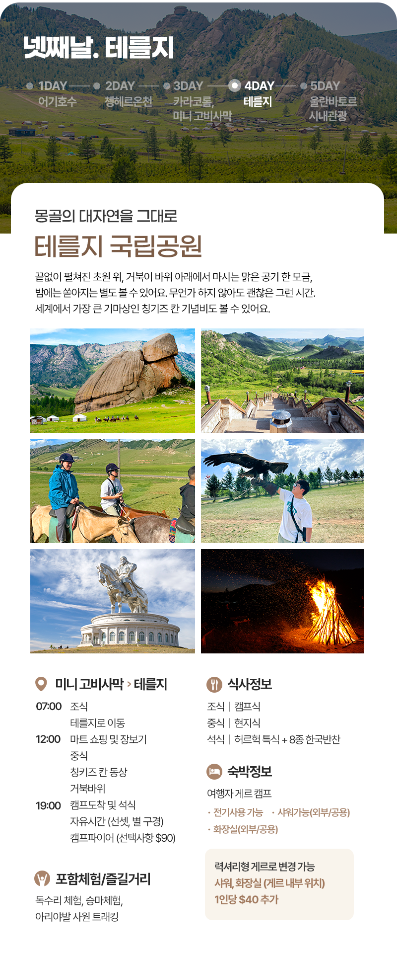 조식(07:00) → 테를지로 이동 → 마트쇼핑 및 장보기 → 중식(현지식) → 칭키즈칸 동상 → 거북바위 → 캠프 도착 및 자유시간 → 석식(허르헉 특식) → 자유시간 (선셋 및 별구경) → 캠프파이어(선택사항/유료)