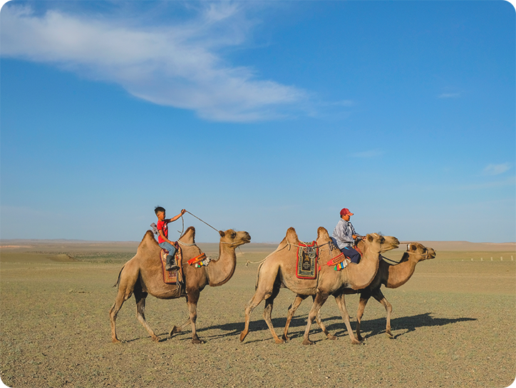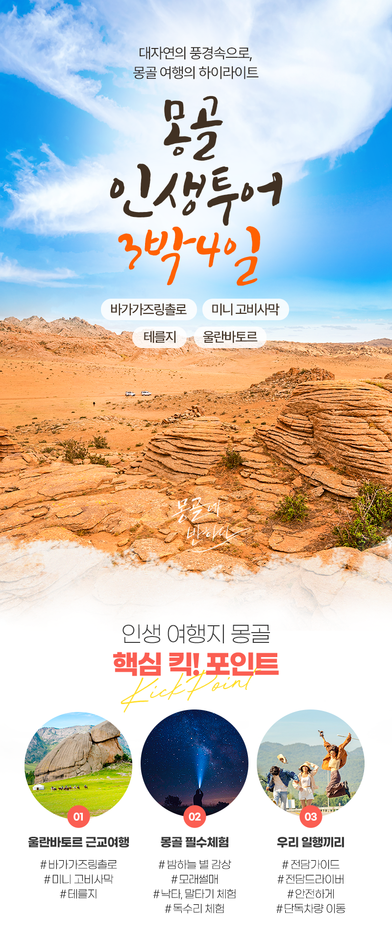 조식 및 이동(07:00) → 중식(현지식) → 미니 고비사막 / 낙타체험 → 캠프도착 및 자유시간 → 석식(캠프식) → 자유시간(선셋 및 별구경)
