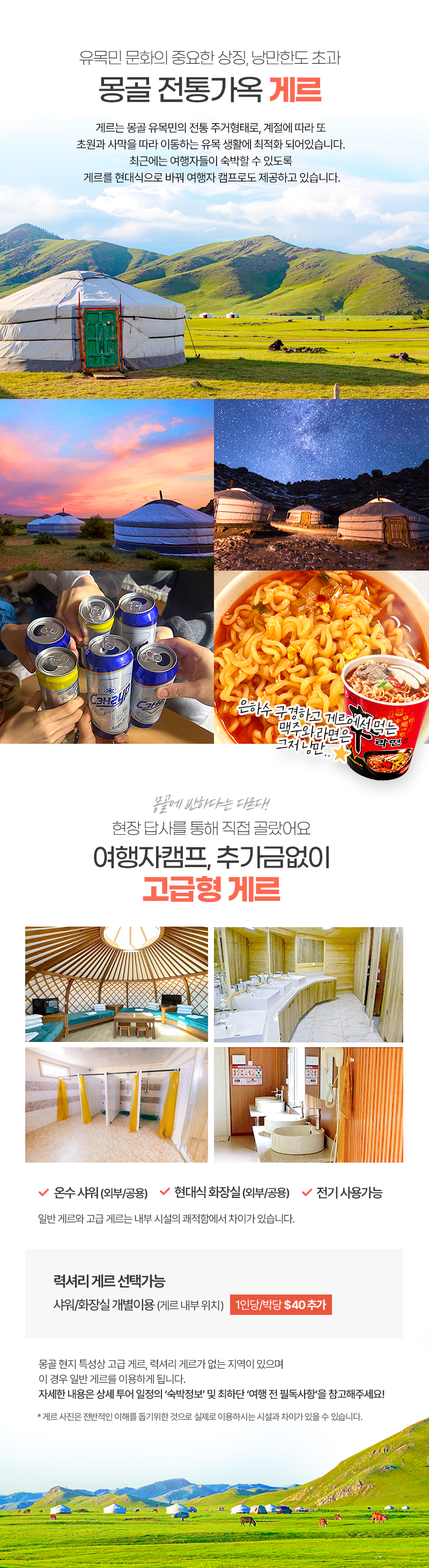* 조식/중식/석식 : 게르 캠프 식당에서 식사를 준비해드리며 중식은 주로 이동 중 외부식당 식사 또는 가이드님이 직접 요리 합니다.