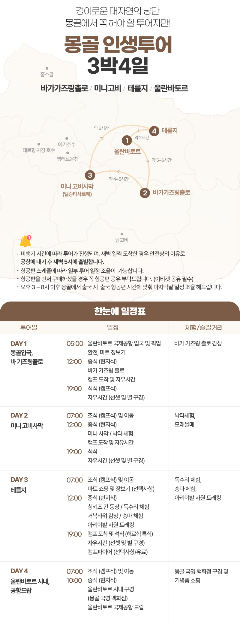 조식(07:00) → 마트쇼핑 및 장보기(선택사항) → 중식(현지식) → 칭키즈칸 동상/독수리체험/거북바위 감상/승마체험/아니야발사원 트래킹 → 캠프 도착 및 자유시간 → 석식(허르헉특식) → 자유시간 (선셋 및 별구경) → 캠프파이어(선택사항/유료)