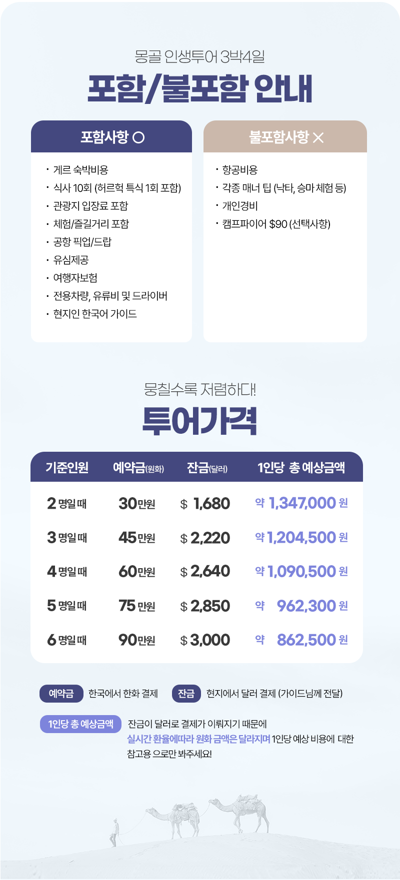 * 테를지 특식 : 허르헉 + 한국식 8종반찬(석식) 1회제공됩니다. 테를지 일정에서만 제공됩니다.