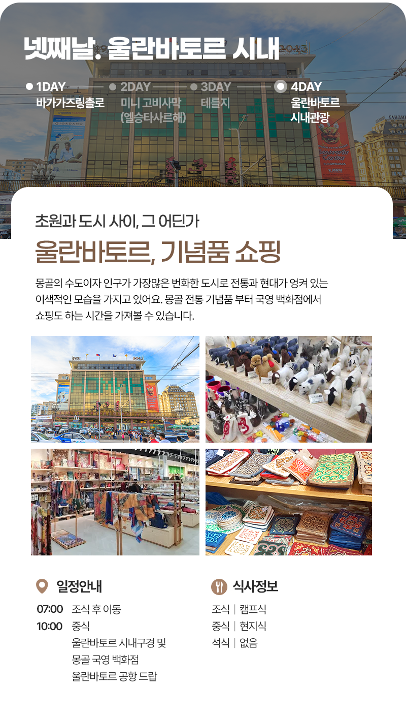 조식(07:00) → 울란바토르로 이동 → 중식(현지식) → 시내관광, 몽골 국영 백화점 → 울란바토르 국제공항 드랍 → 한국도착