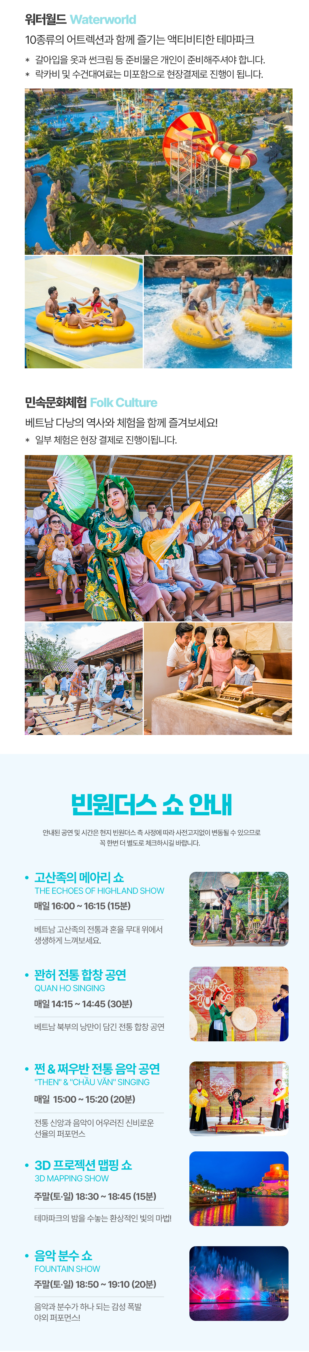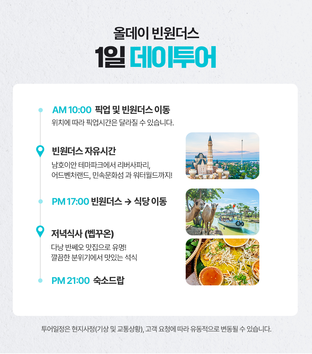 픽업 및 빈원더스로 이동(10:00) → 빈원더스 자유시간 및 중식 뷔페 → 빈원더스 자유일정 → 저녁식사 → 리조트드랍