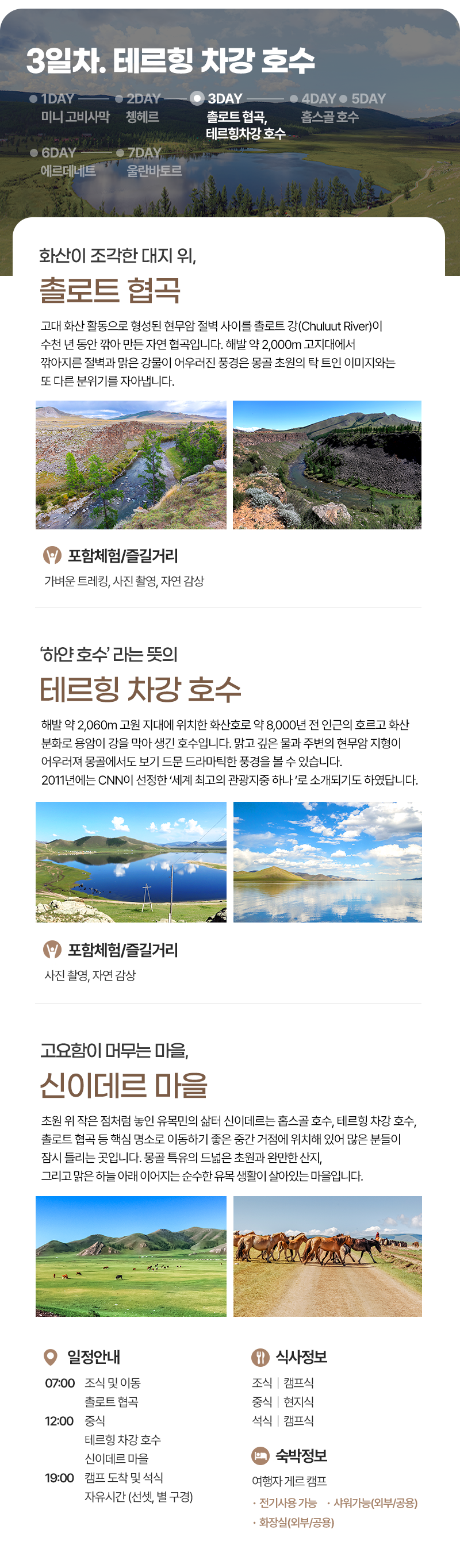조식(07:00) → 촐로트 협곡 →중식(현지식) →테르힝 차강호수 →신이데르 마을 도착 → 캠프도착 및 자유시간 → 석식(캠프식) → 자유시간 (선셋 및 별구경)