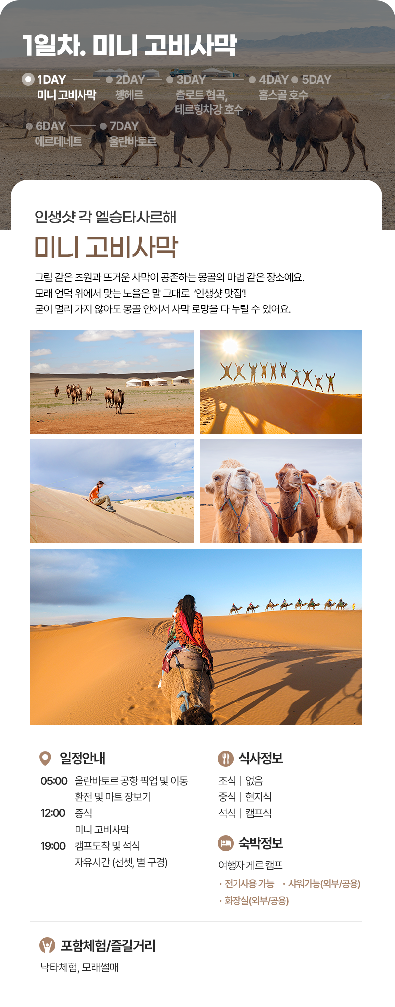 공항 픽업(05:00) → 환전 및 마트 장보기 → 중식(현지식) → 미니 고비사막 → 캠프도착 및 자유시간 → 석식(캠프식) → 자유시간 (선셋 및 별구경)