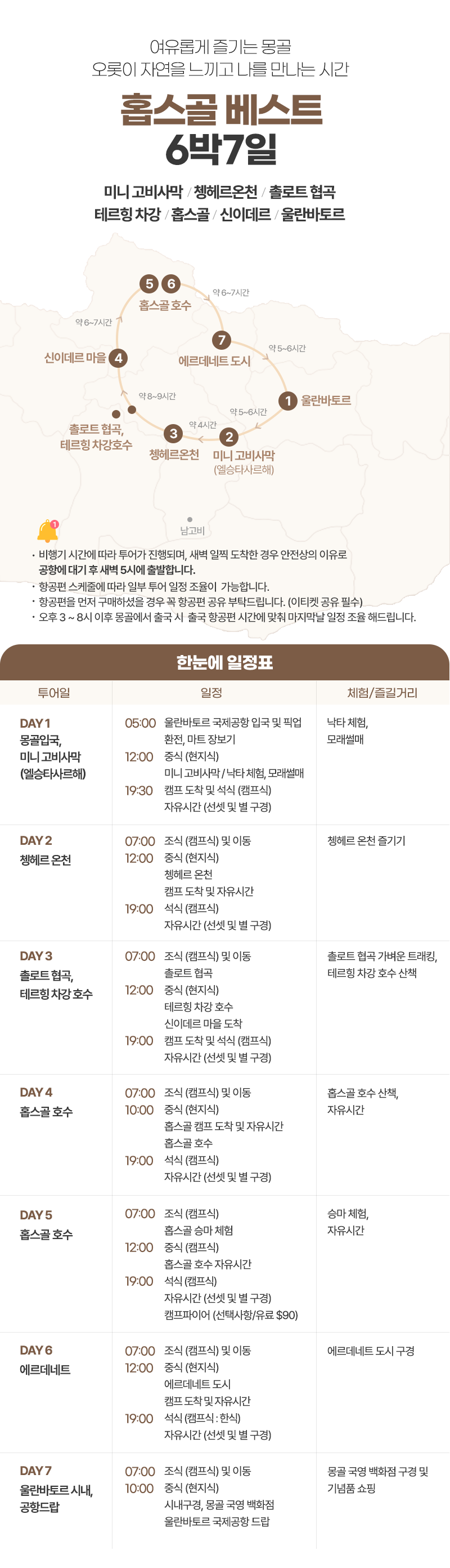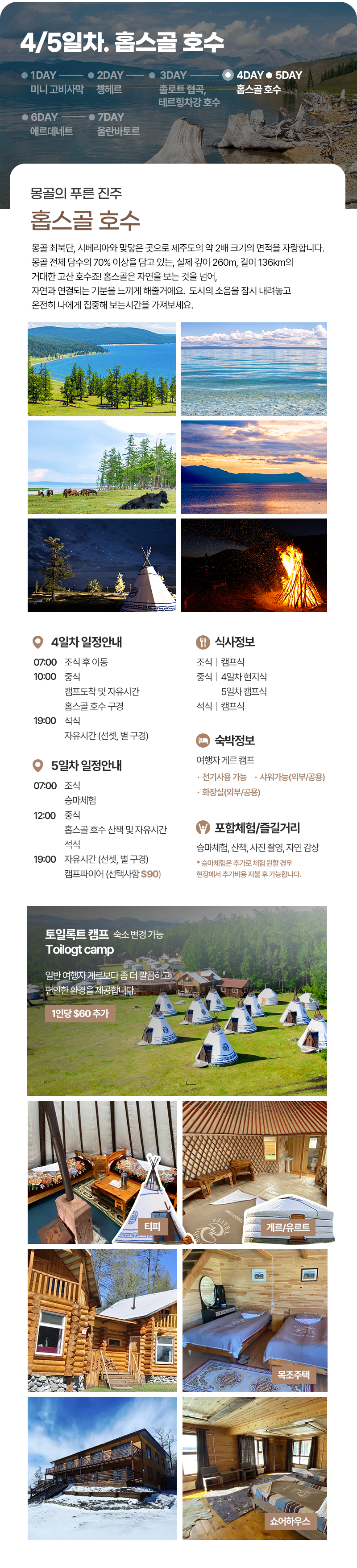 조식(07:00) → 중식(현지식) → 캠프 도착 및 자유시간 → 홉스골 호수 → 캠프 도착 및 석식(캠프식) → 자유시간 (선셋 및 별구경)