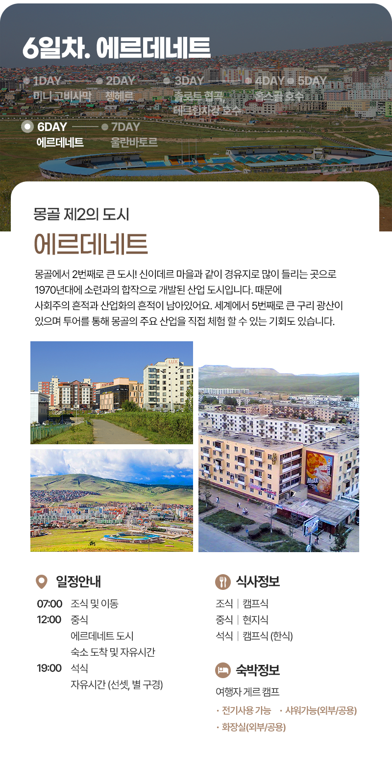 조식(07:00) → 중식(현지식) → 에르데네트 도시 → 캠프 도착 및 자유시간 → 석식(캠프식)→ 자유시간 (선셋 및 별구경)