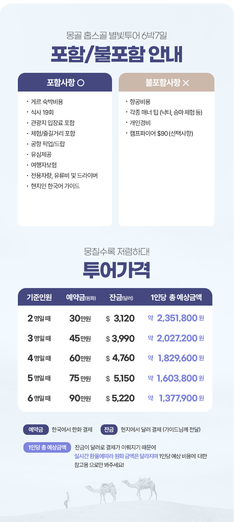 * 캠프식은 여행자 게르 캠프 식당에서 조리하여 제공되므로 매일 달라집니다.