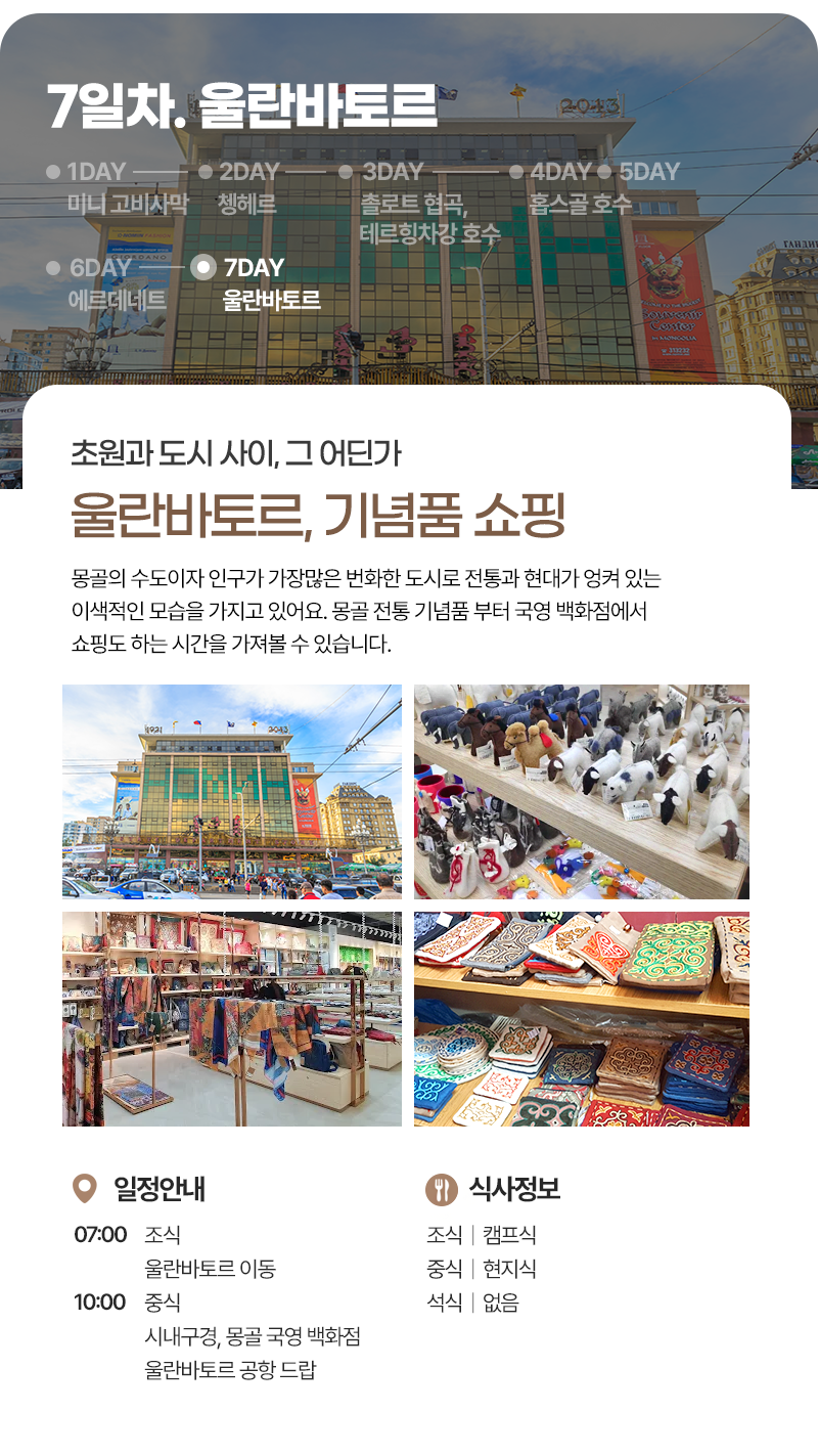조식(07:00) → 울란바토르로 이동 → 중식(현지식) → 시내관광, 몽골 국영 백화점 → 울란바토르 국제공항 드랍 → 한국도착
