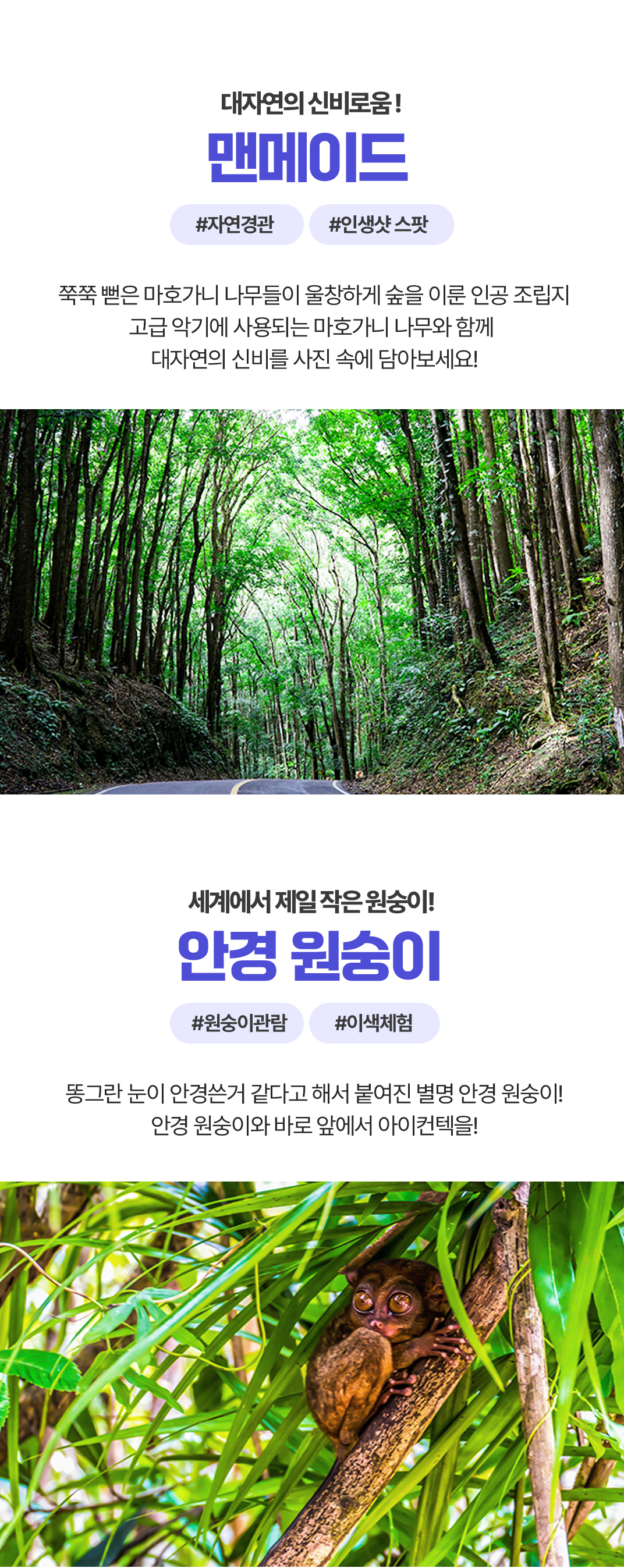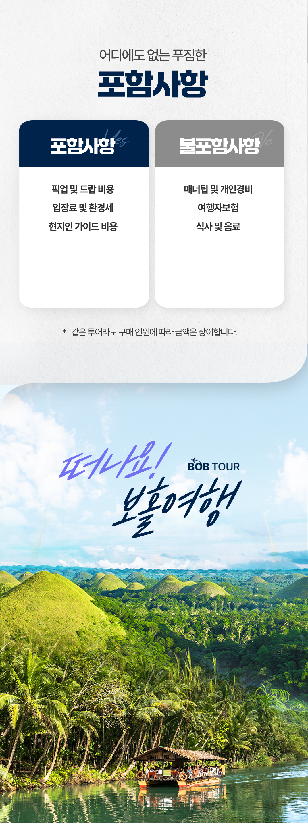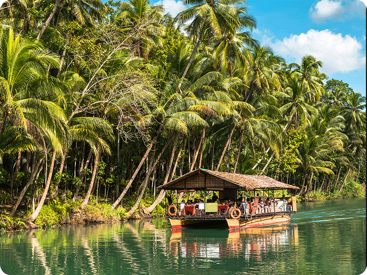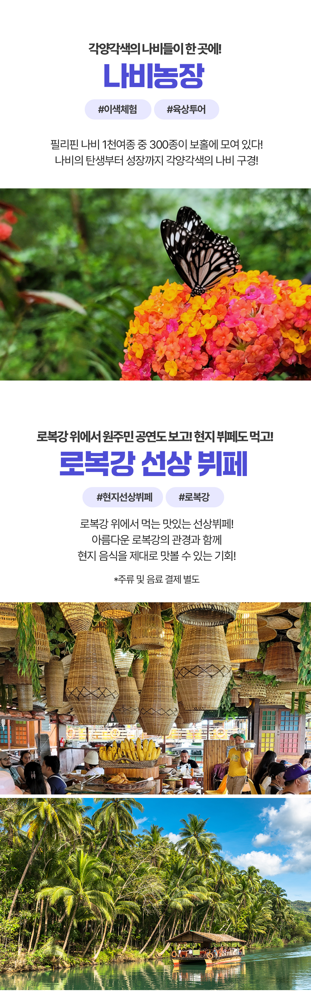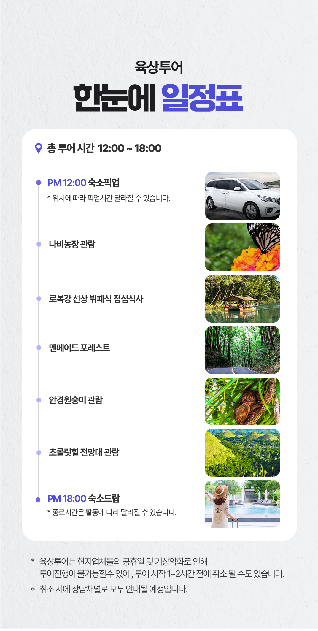 픽업(12:00) → 나비농장 관람 → 로복강 선상 뷔페식 점심식사 → 멘메이드 포레스트 → 안경원숭이 관람 → 초콜릿 힐 전망대 관람 → 드랍(18:00)