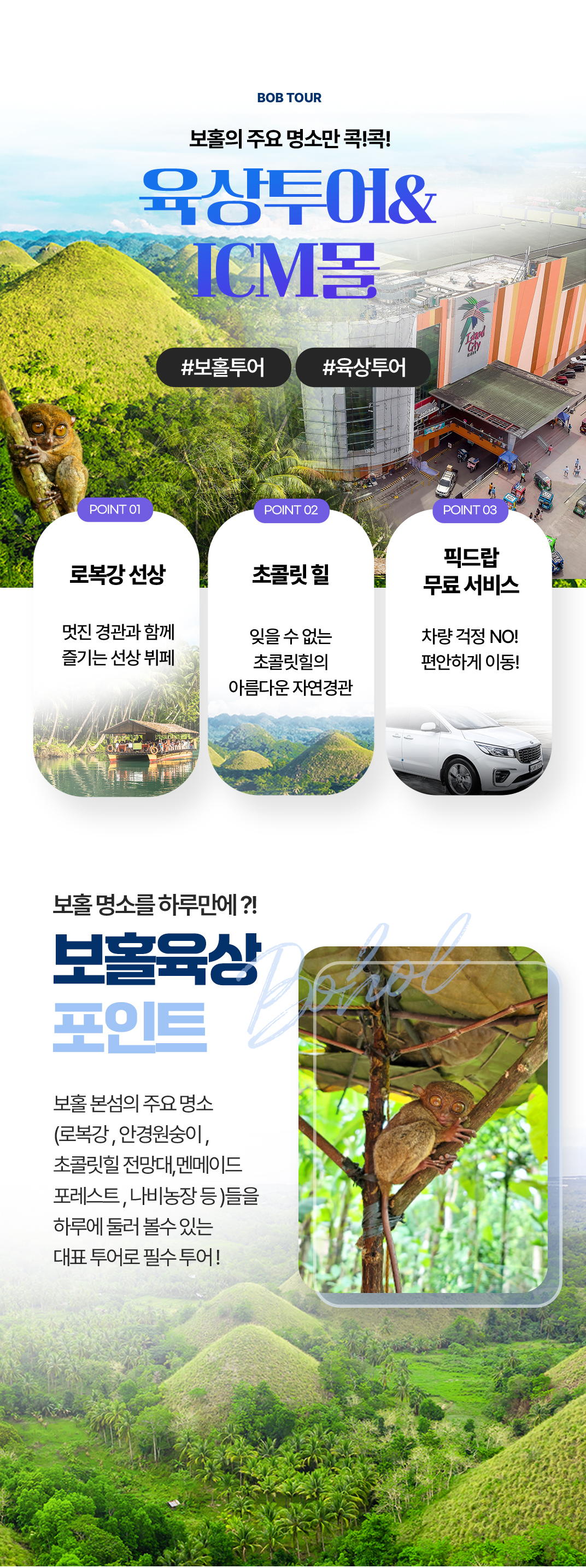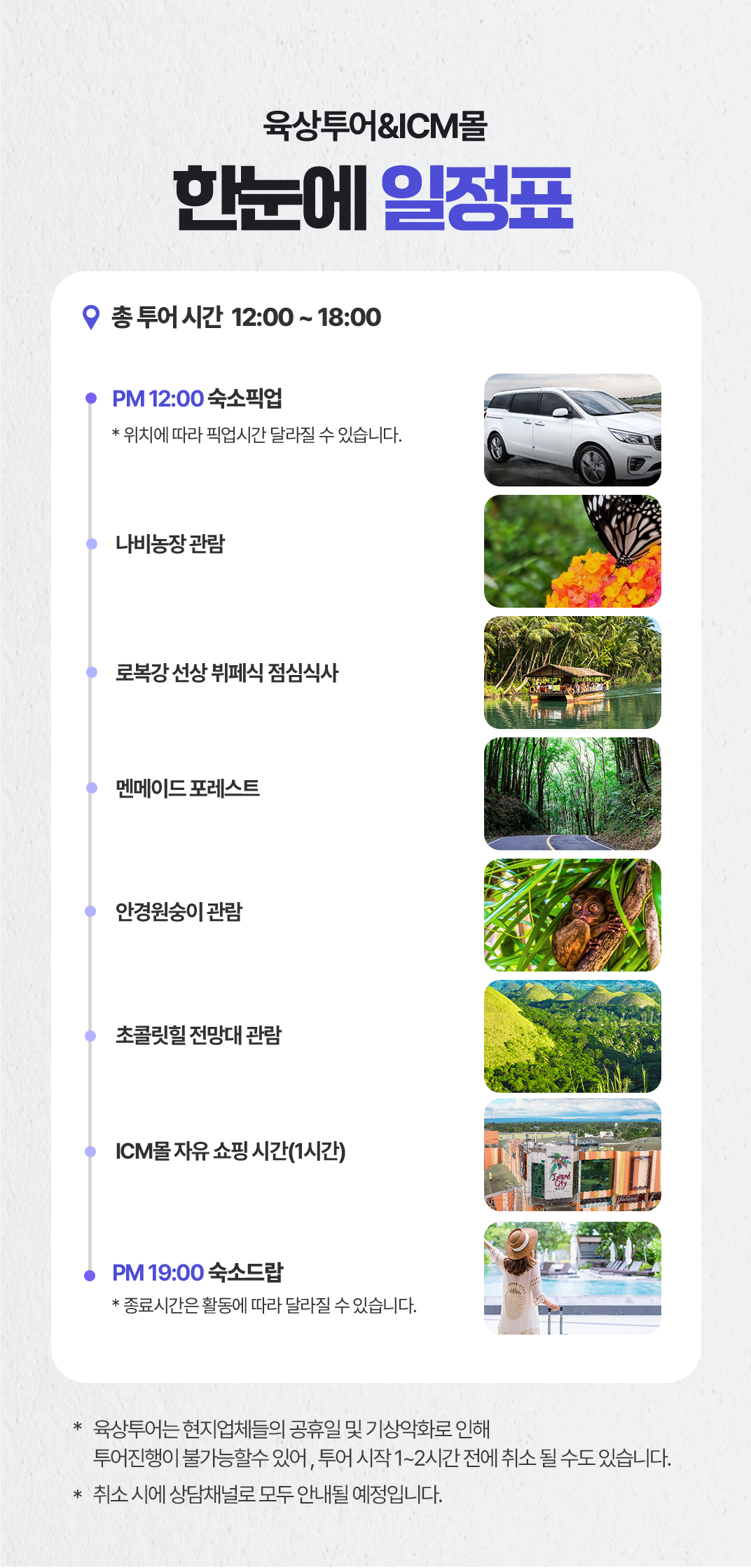 픽업(12:00) → 나비농장 관람 → 로복강 선상 뷔페식 점심식사 → 멘메이드 포레스트 → 안경원숭이 관람 → 초콜릿 힐 전망대 관람 → ICM몰 자유 쇼핑1시간 → 드랍(18:00)