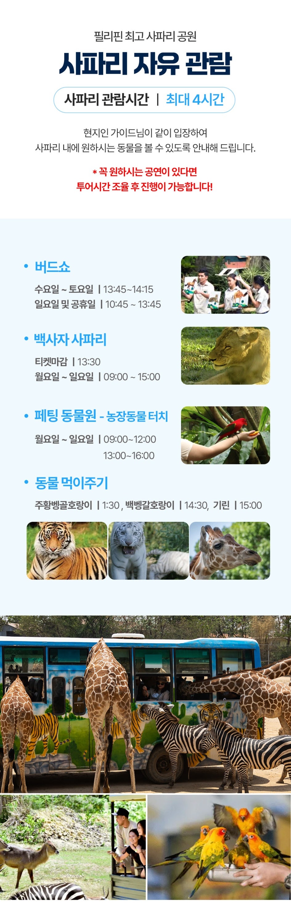 * 원하시는 공연이 있을 시 투어 시간 조율 후 진행이 가능합니다. (버드쇼, 백사자 사파리, 페팅 동물원, 동물 먹이주기)
