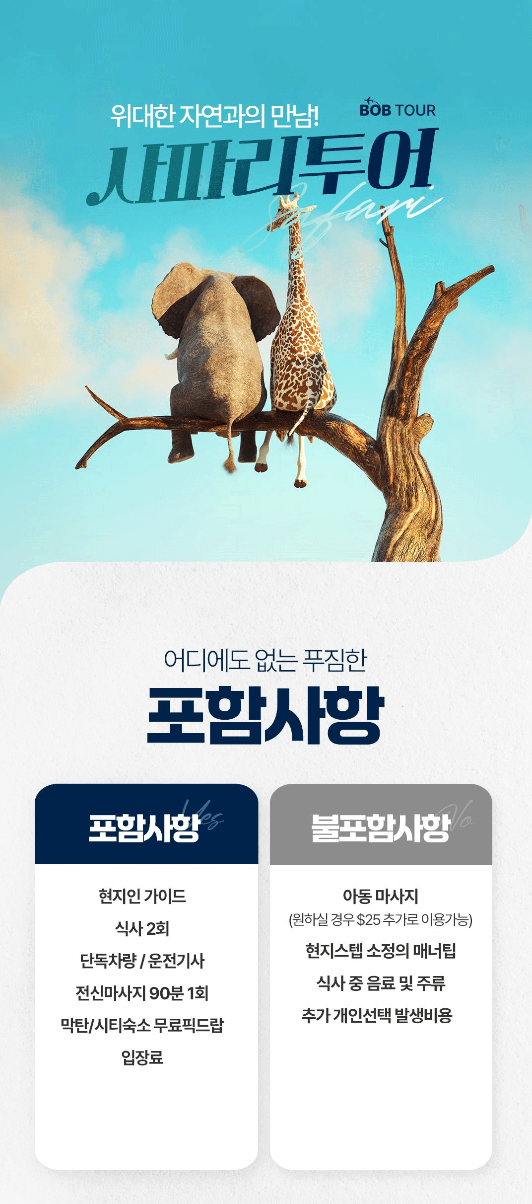 무료제공 사파리 입장료, 전신마사지 90분(오일 또는 드라이 선택가능)